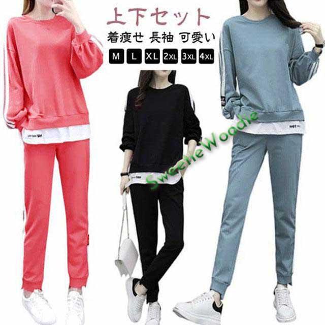 パーカー 上下セット 重ね風 運動着 ジャージ ルームウェア レディース 着痩せ おしゃれ 長袖 スウェット スウェットパンツ 大きいサイズ カジュア