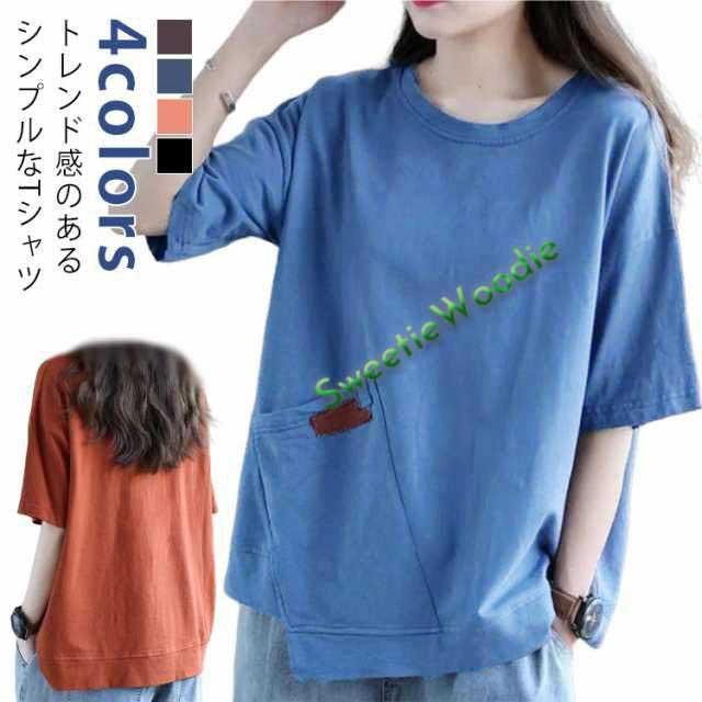 Tシャツ レディース 半袖 春夏 無地 アシンメトリー ヴィンテージ感 トップス 半袖 体型カバー ゆったり オーバーサイズ 五分袖 ビッグシルエット