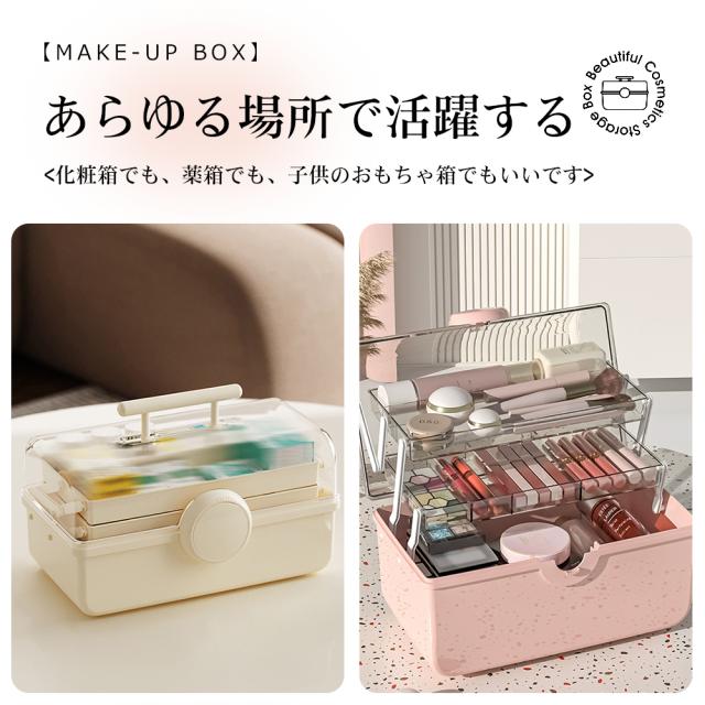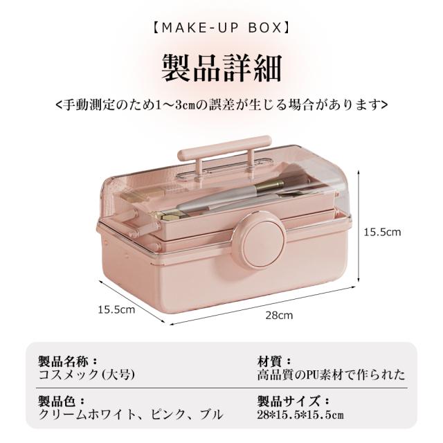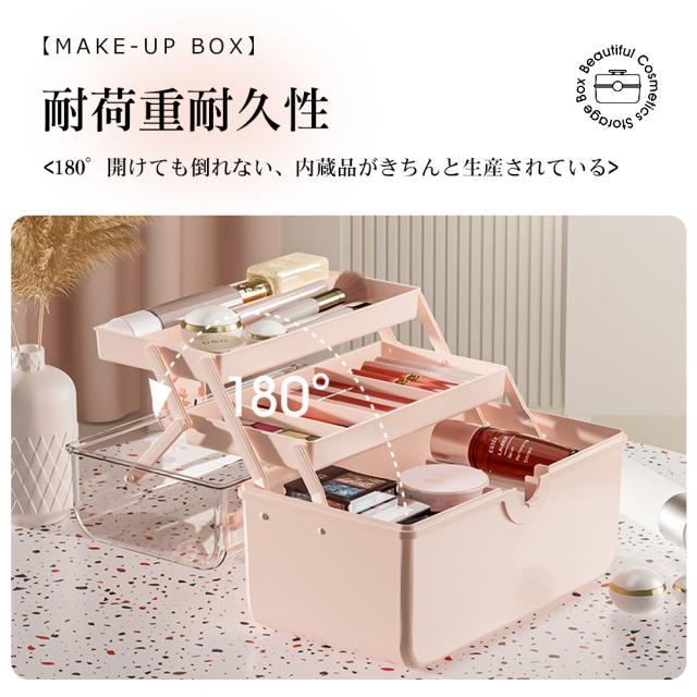 おすすめポイント三段収納ボックス:<高さ15.5cmのポトルまで収納可能な大容量スペース>軽量で持ち運びが簡単:<どのような場所でも、コスメアイテムをしっかり収納できます。>回転オン:<意外な転倒や落下を恐れずに簡単に閉める>防水防湿:<密封収納、効果的に塵埃水蒸気を遮断する>透明カバー:<1秒で取り込み、内蔵品が一目でわかる>耐荷重耐久性:<180°開けても倒れない、内蔵品がきちんと生産されている>