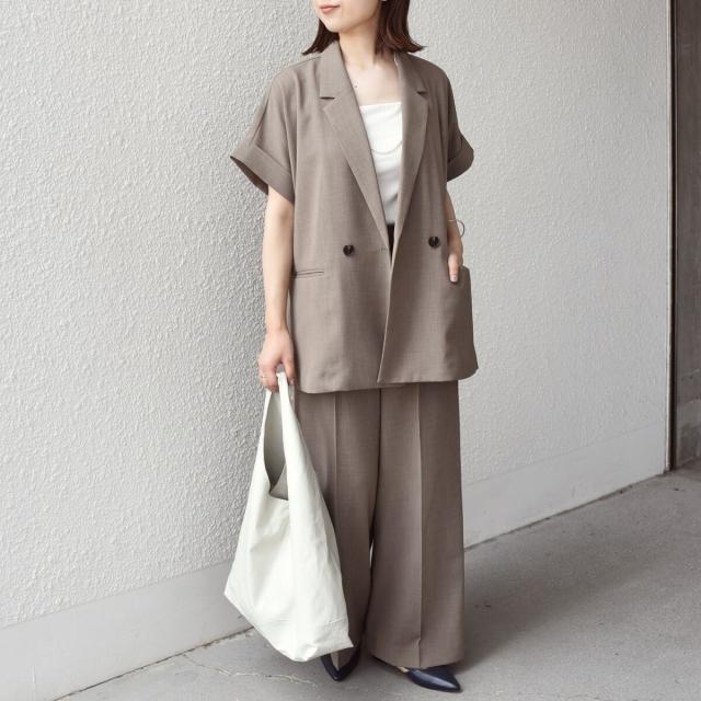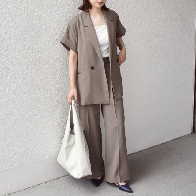 同素材のジャケットとの合わせで、綺麗めなセットアップスタイルに。