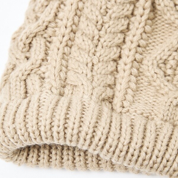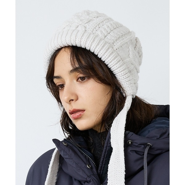 暖かみあるケーブル編みとリボンが付いているのが魅力なアイテム。