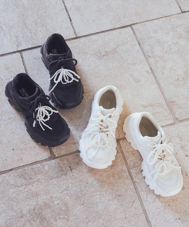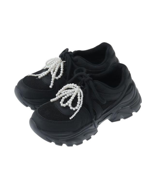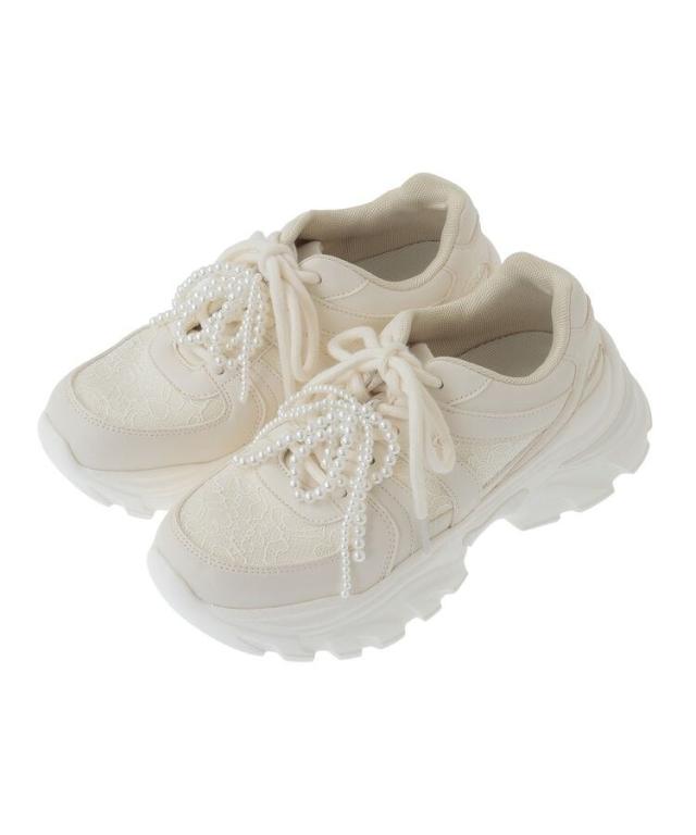 艶めくパールビーズのリボンチャームが目を惹くスニーカー。しっかりと高さのあるボリュームソールでスタイルアップを叶えてくれるのも嬉しいポイントです。アッパーにレース×合皮素材を合わせたMIXデザイン。履くだけで足元を華やかに演出してくれるおすすめのアイテムです。