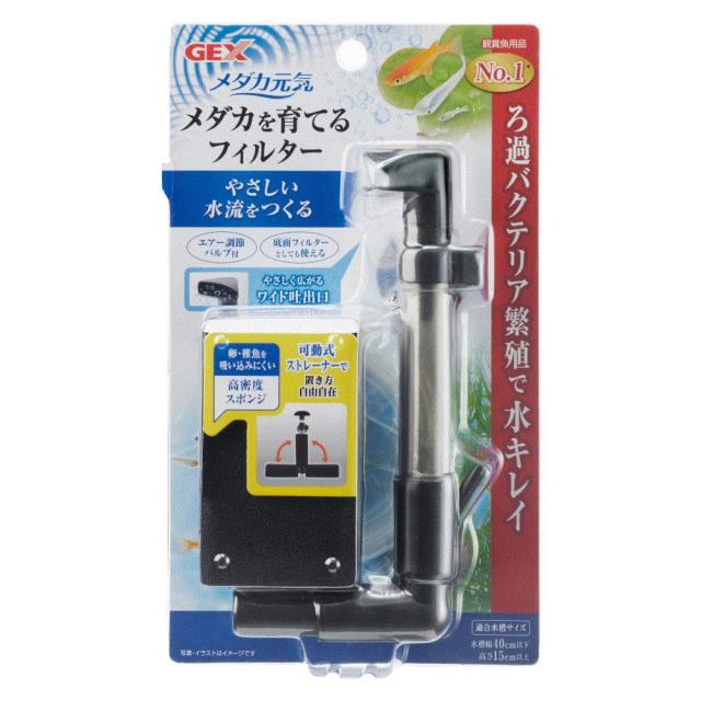 メダカにやさしい水流をつくる、メダカ用スポンジフィルター! ●特長 エアーをやさしく拡散させるワイド吐出口とエアー調節バルブで、メダカにやさしい水流をつくります。 4972547041678
