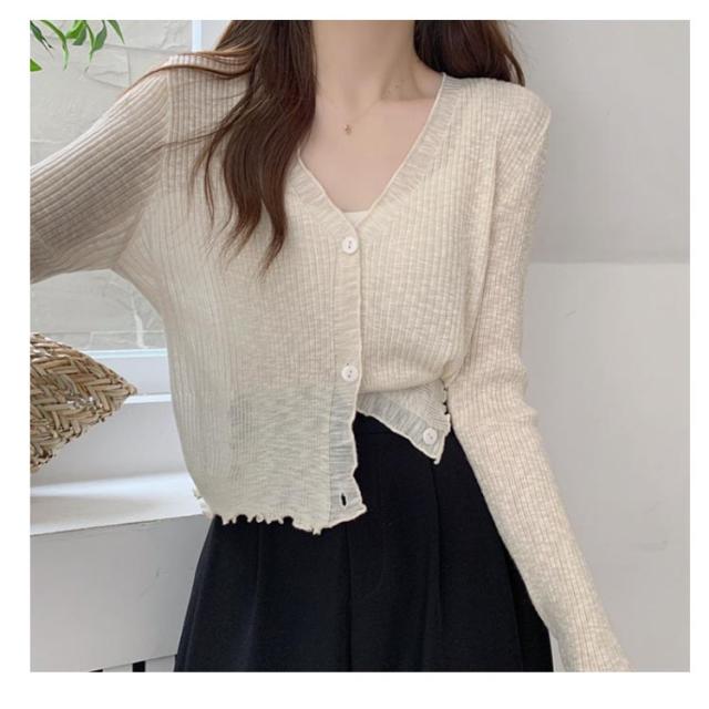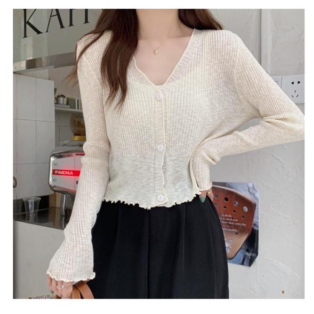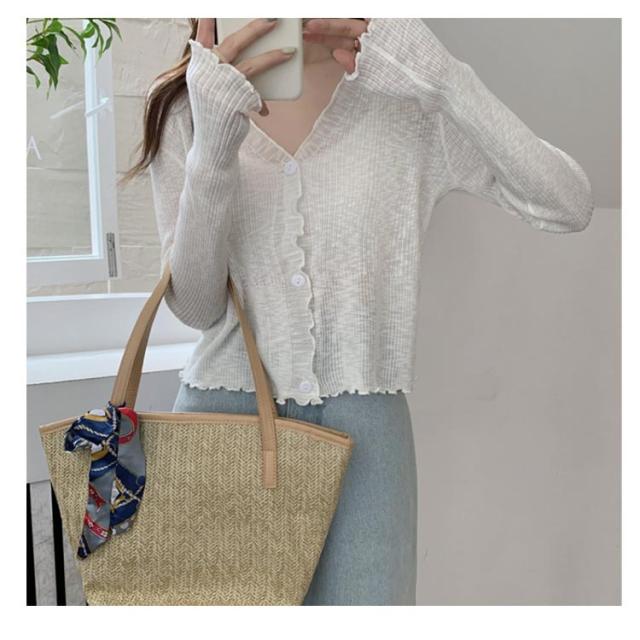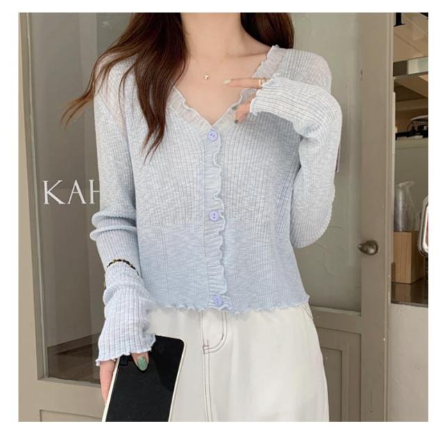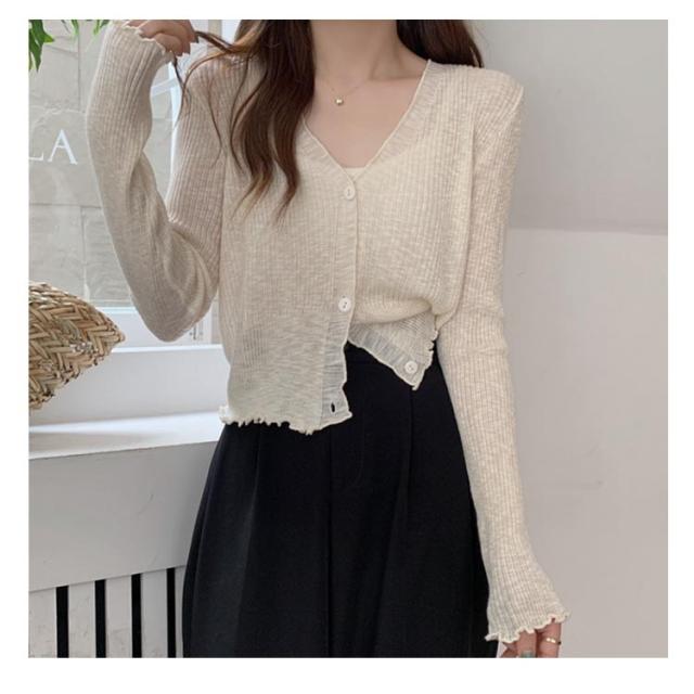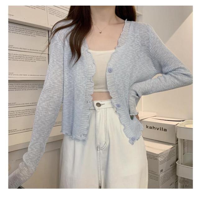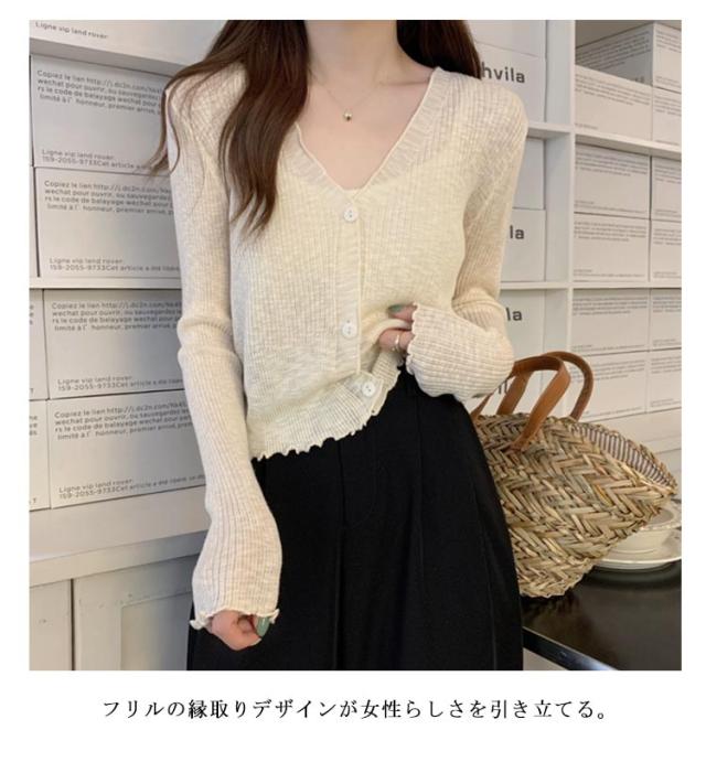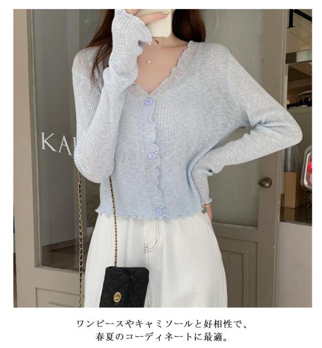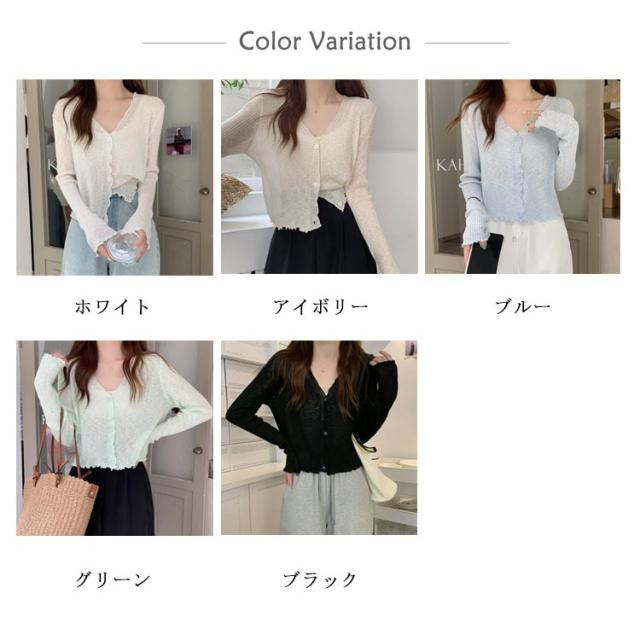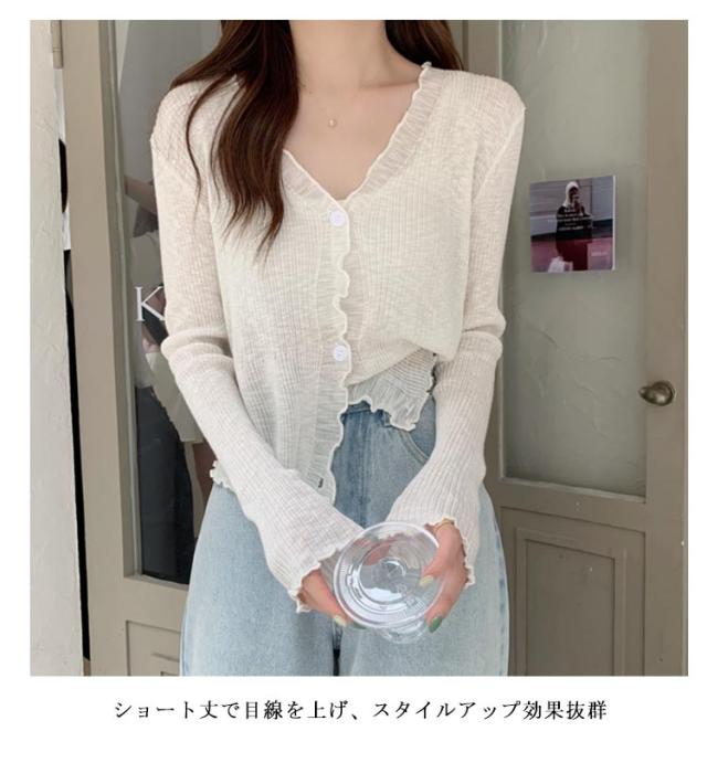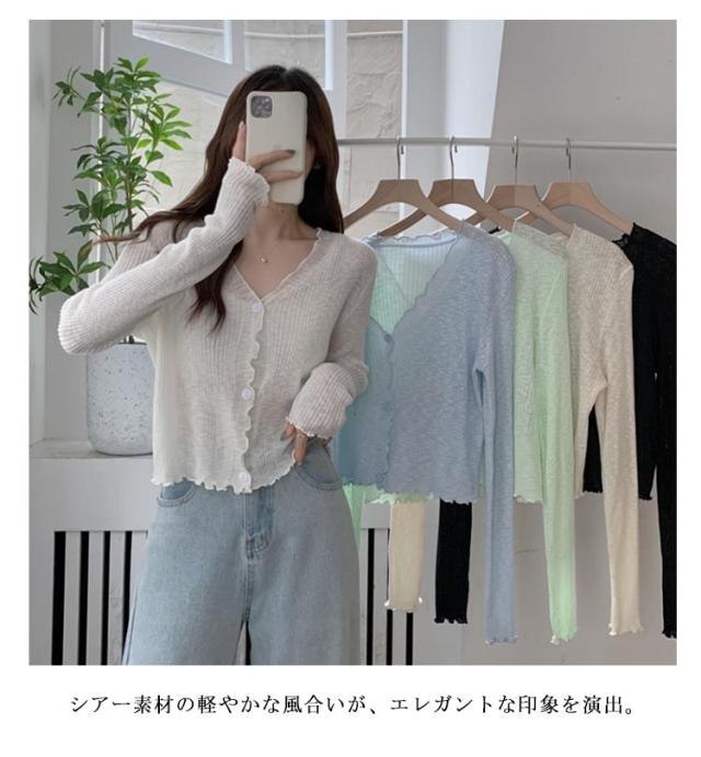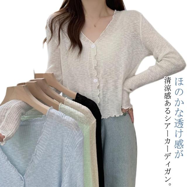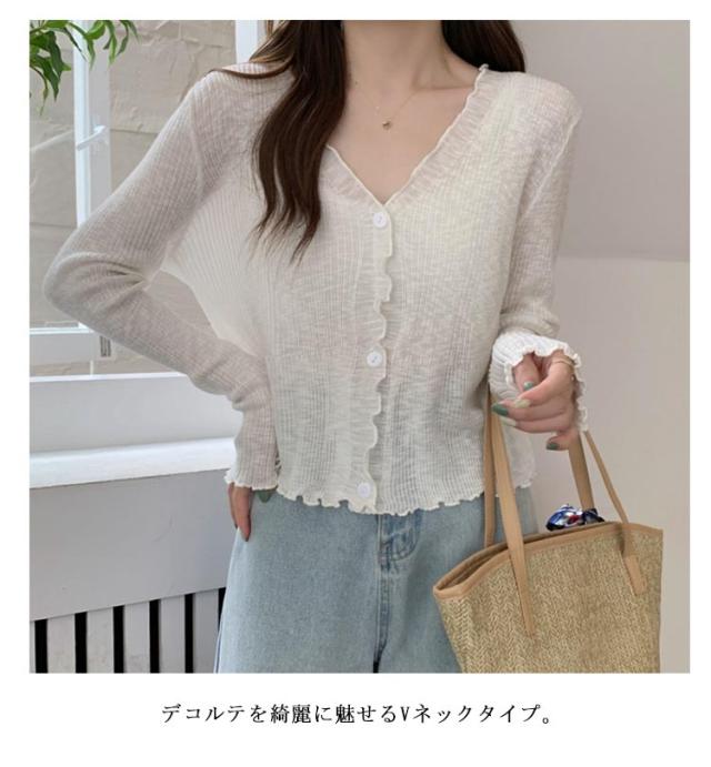 ショート丈 シアー カーディガン フリル メロウ 薄手 ニットカーディガン 長袖 vネック トップス レディース サマーニット メロウフリル 透け感 羽織り 涼しい 重ね着 日焼け対策 紫外線対策 通勤 軽量 ホワイト ブラック アイボリー グリーン ブルー