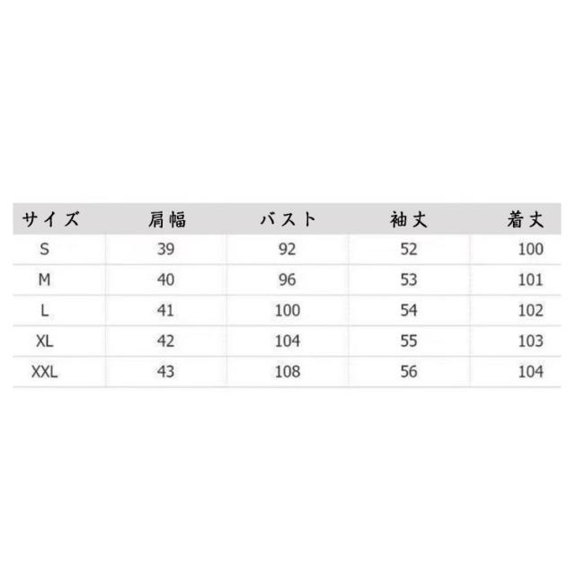 | サイズについての説明 | S 肩幅39cm バスト92cm 袖丈52cm 着丈100cm M 肩幅40cm バスト96cm 袖丈53cm 着丈101cm L 肩幅41cm バスト100cm 袖丈54cm 着丈102cm XL 肩幅42cm バスト104cm 袖丈55cm 着丈103cm 2XL 肩幅43cm バスト108cm 袖丈56cm 着丈104cm |