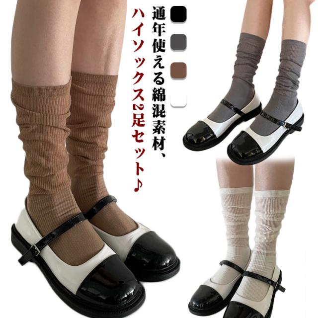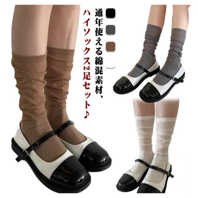 ルーズソックス レディース 2足組 リブ おしゃれ ハイソックス 靴下 くつ下 かわいい おしゃれ 白 春夏 秋 黒 4色 くしゅくしゅ 無地 ロング スクール 女子高生 通学 綿 コットン 送料無料