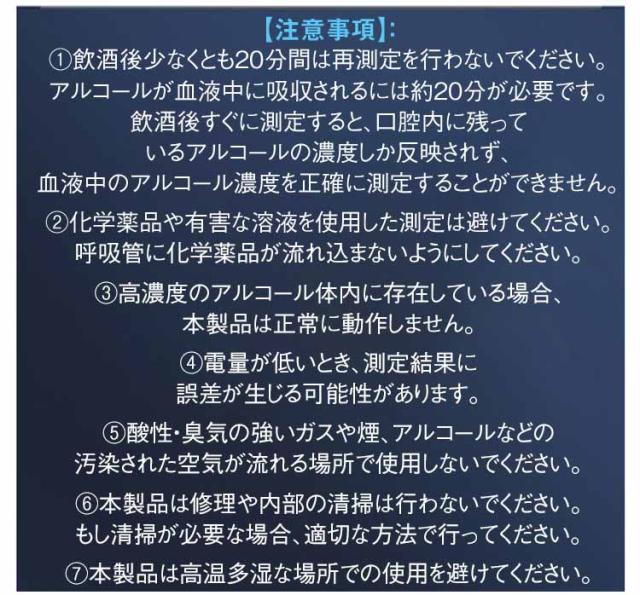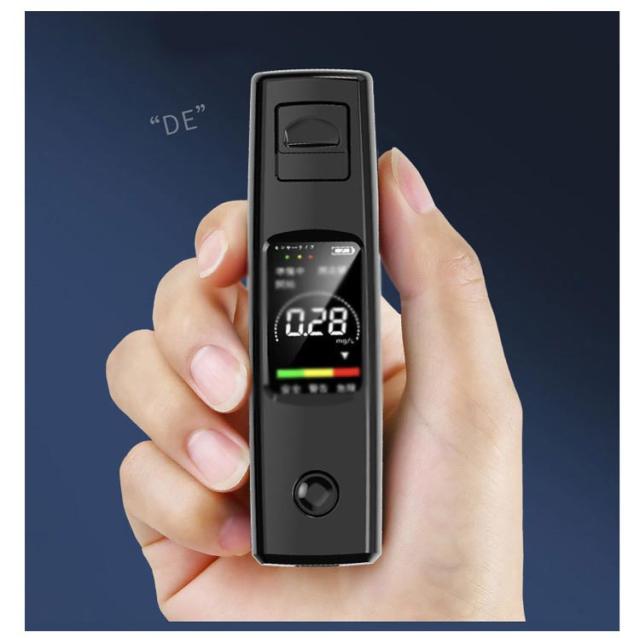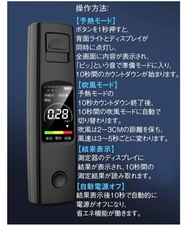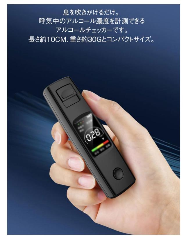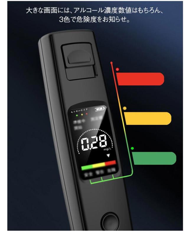 | 息を吹きかけるだけ。 呼気中のアルコール濃度を計測できるアルコールチェッカーです。 大きな画面には、アルコール濃度数値はもちろん、3色で危険度をお知らせ。 基準値を超えて危険な状態の場合は音でもお知らせします。 夜でも見やすい液晶バックライトなので、暗い屋外や車内でもしっかり確認できます。 口を直接つけない、非接触型なので衛生的。 使用していないときは蓋を閉めて汚れるのを防ぎます。 長さ約10cm、重さ約30gとコンパクトサイズ。 さらにUSB充電式なので、カバンやポケットに入れて持ち歩きOK。 いつでもどこでもチェックすることができます。 操作方法: 【予熱モード】 ボタンを1秒押すと、背面ライトとディスプレイが同時に点灯し、全画面に内容が表示され、「ピッ」という音で準備モードに入り、10秒間のカウントダウンが始まります。 【吹風モード】 予熱モードの10秒カウントダウン終了後、10秒間の吹風モードに自動で切り替わります。吹風は2−3cmの距離を保ち、風速は3〜5秒ごとに変わります。 【結果表示】 測定器のディスプレイに結果が表示され、10秒間の測定結果が読み取れます。 【自動電源オフ】 結果表示後10秒で自動的に電源がオフになり、省エネ機能が働きます。 【注意事項】: 1.飲酒後少なくとも20分間は再測定を行わないでください。アルコールが血液中に吸収されるには約20分が必要です。飲酒後すぐに測定すると、口腔内に残っているアルコールの濃度しか反映されず、血液中のアルコール濃度を正確に測定することができません。 2.化学薬品や有害な溶液を使用した測定は避けてください。呼吸管に化学薬品が流れ込まないようにしてください。 3.高濃度のアルコール体内に存在している場合、本製品は正常に動作しません。 4.電量が低いとき、測定結果に誤差が生じる可能性があります。 5.酸性・臭気の強いガスや煙、アルコールなどの汚染された空気が流れる場所で使用しないでください。 6.本製品は修理や内部の清掃は行わないでください。もし清掃が必要な場合、適切な方法で行ってください。 7.本製品は高温多湿な場所での使用を避けてください。 | |