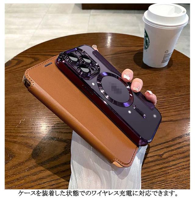 | 【レンズ保護カバー 一体型】【MagSafe充電器対応】【高級感メッキカバー】 Magsafe対応 手帳型ケース。 強い耐衝撃タイプ、キズを防ぎ、軽微な振動や衝撃から守ります。 柔らかい素材で、取り付きもしやすいので、本体に傷つけにくい。 ケースを装着した状態でのワイヤレス充電に対応できます。 背面は透明度が長期間持続し、iPhoneのオリジナルのデザインを活かすことができます。 カードポケット3つついておりますので、通勤や旅にも便利です。 カメラレンズ保護フィルムー体型。ケースとカメラレンズフィルムが一体なのでカメラレンズに直接傷や汚れが付かない。除間からのホコリの侵入も防ぐ。 | |