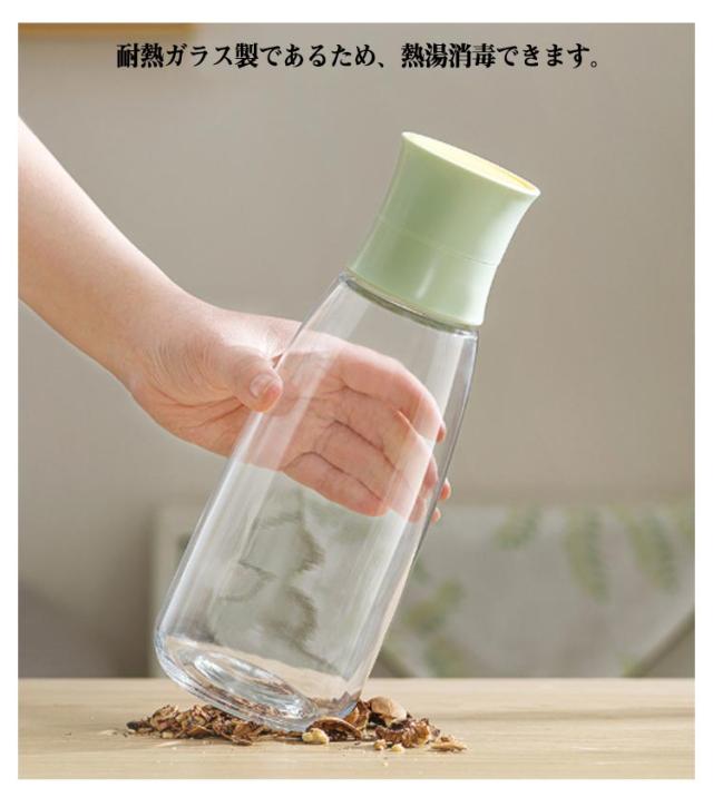 | 素材 | キャップ・注ぎ口:PP樹脂 栓:シリコン ボトル本体:耐熱ガラス |