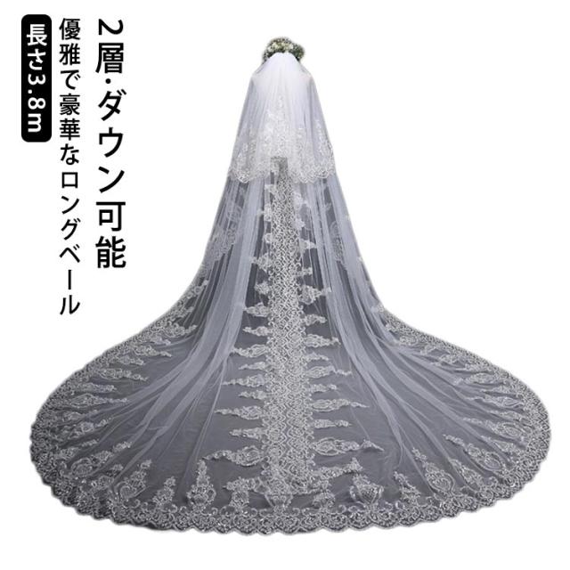 ウエディングベール ウェディング ロングベール ウェディング 結婚式 ヘッドドレス ヴェール 2層 レース 刺? ベール ダウン可能 3.8M 華奢 エレガント 高級感 おしゃれ コーム付 花嫁 ヘアアクセサリー 贅沢 髪飾り 披露宴