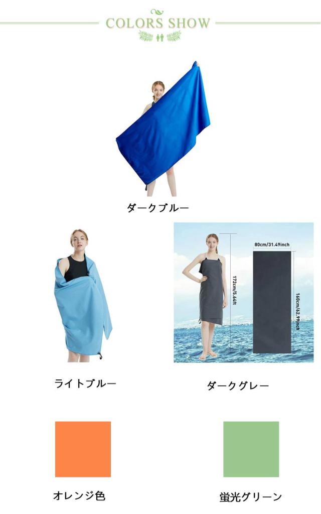 | 砂がつかない!スクエア型ビーチタオル、羽織っても、敷いても、拭いてもOK! 肌触りが良く吸水性に優れたマイクロファイバー生地を使用。 砂がつきにくく、ビーチから砂を持ち帰る心配はありません! 折りたたみ可能なコンパクト設計で、簡単にバッグに入れる。 ビーチや旅行や温泉等のアウトドア活動に最適! | |