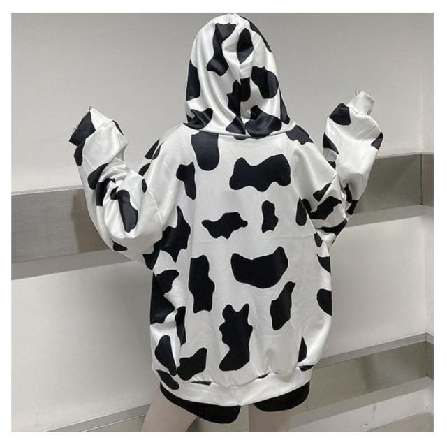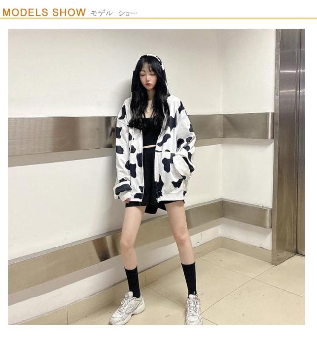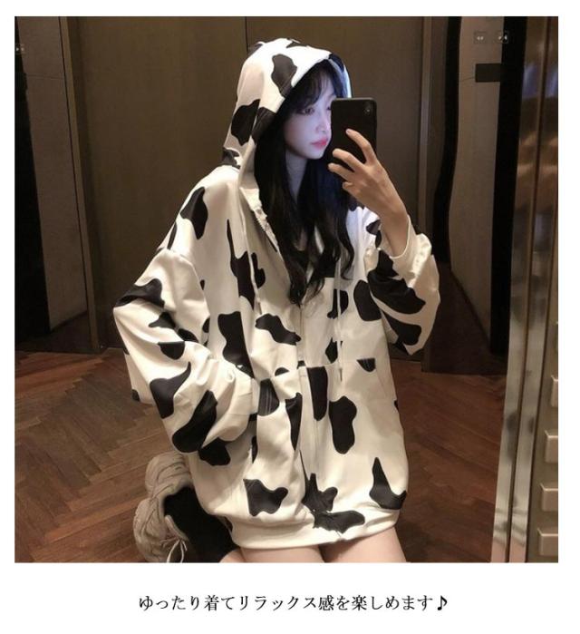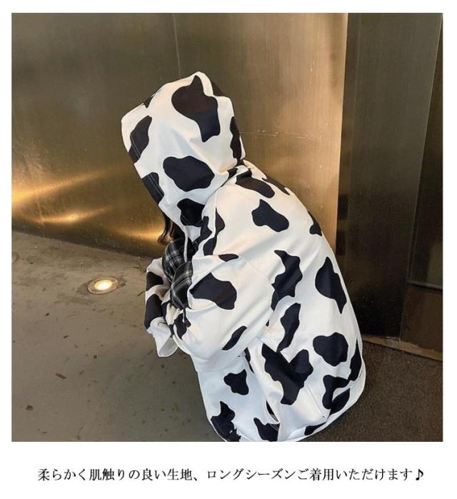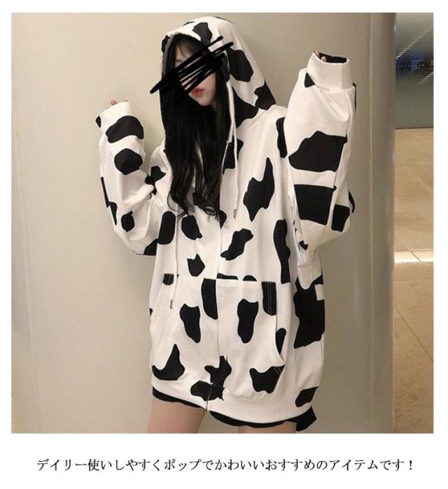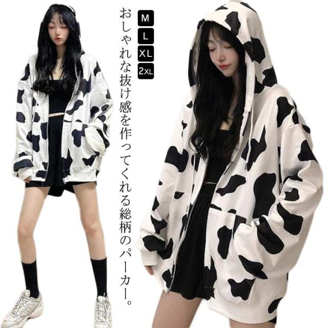 スウェット 薄手 COW柄 パーカー 量産型 トレーナー 羽織り 長袖パーカー オーバーサイズ ロング丈 フード付き ジップパーカー ジップアップ 地雷系 ジップアップ 原宿風 ストリート系 韓国ファッション 大きいサイズ 個性的