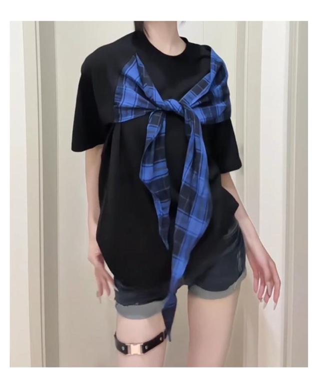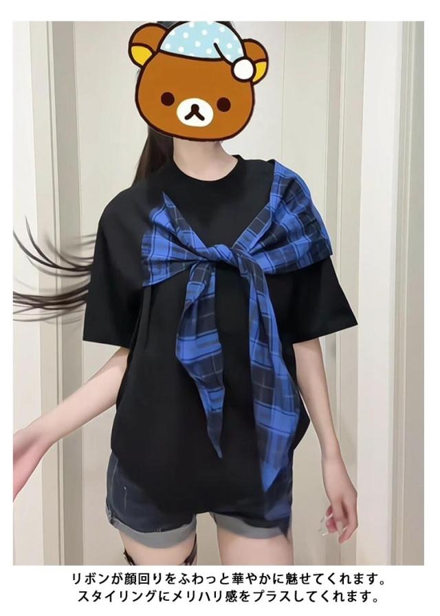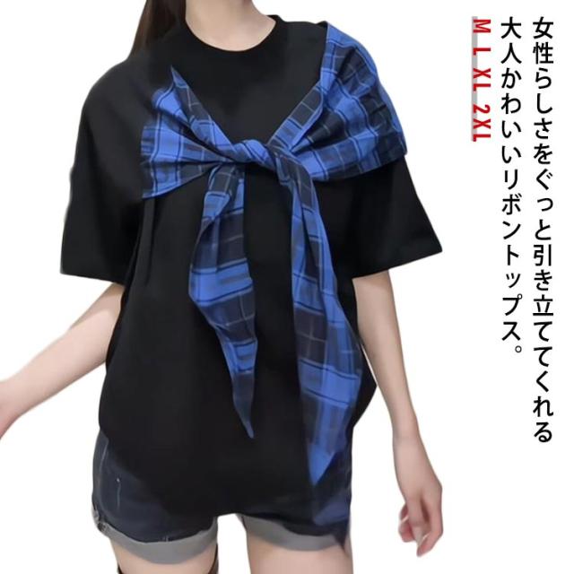 tシャツ バイカラー リボン レディース 斜め スカーフ巻きレイヤード風Tシャツ カットソー スカーフ巻きレイヤード風Tシャツ デザイン 半袖 チェック柄 着やせ 体型カバー 細見え リラックス tシャツ ブラック ホワイト 無地tシャツ