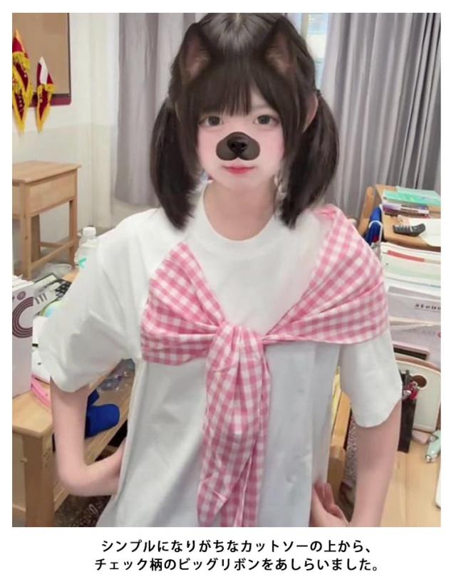 | 女性らしさをぐっと引き立ててくれる大人かわいいリボントップス。 シンプルになりがちなカットソーの上から、チェック柄のビッグリボンをあしらいました。 単調になりがちなTシャツスタイルにフェミニンな可愛さをアクセントに加えました。 リボンが顔回りをふわっと華やかに魅せてくれます。スタイリングにメリハリ感をプラスしてくれます。 窮屈感のない程よくゆとりのあるシルエット。すっきりしたシルエットのスカートやミニボトム合わせがおすすめです。 シンプルなボトムスに合わせたい、1枚でオシャレに見える主役級トップスです。 | |