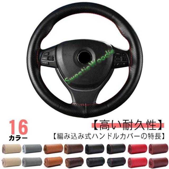 全16色!牛革 編み込み ステアリングカバー ハンドル ハンドルカバー 本革 編み上げ 手縫い レザー ステアリング カバー 無地 シンプル おしゃれ