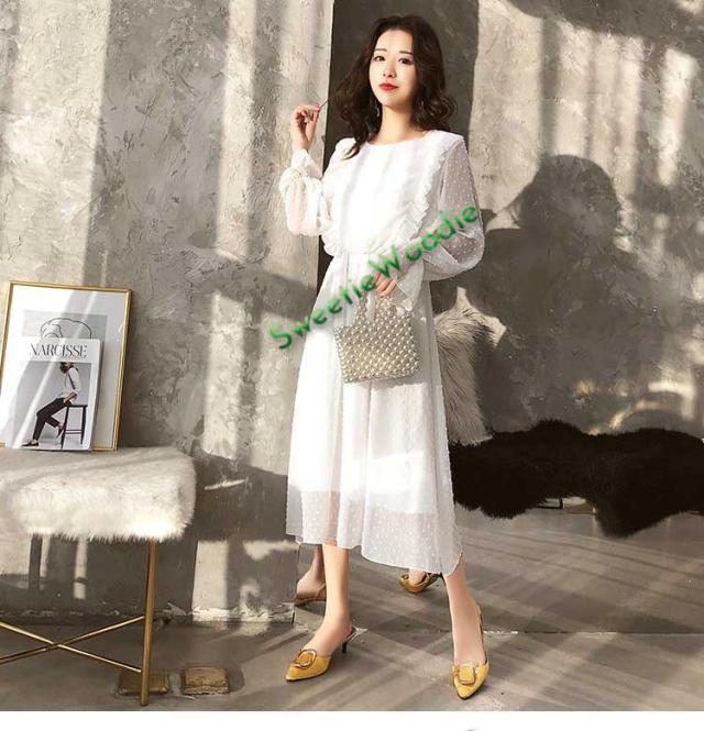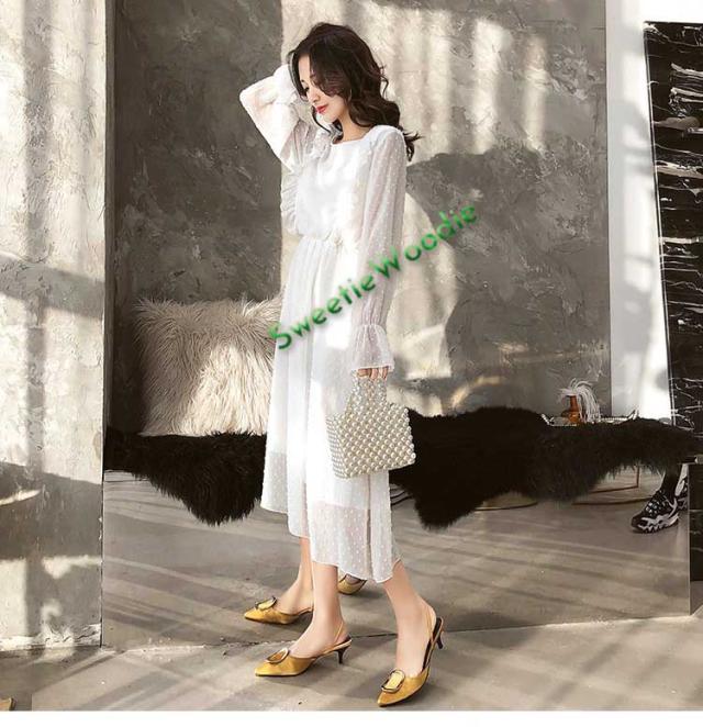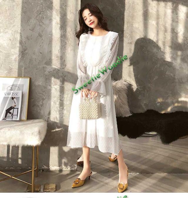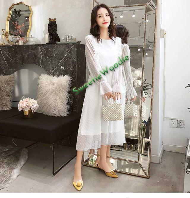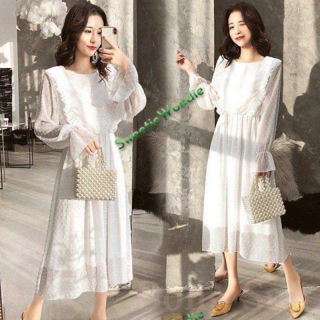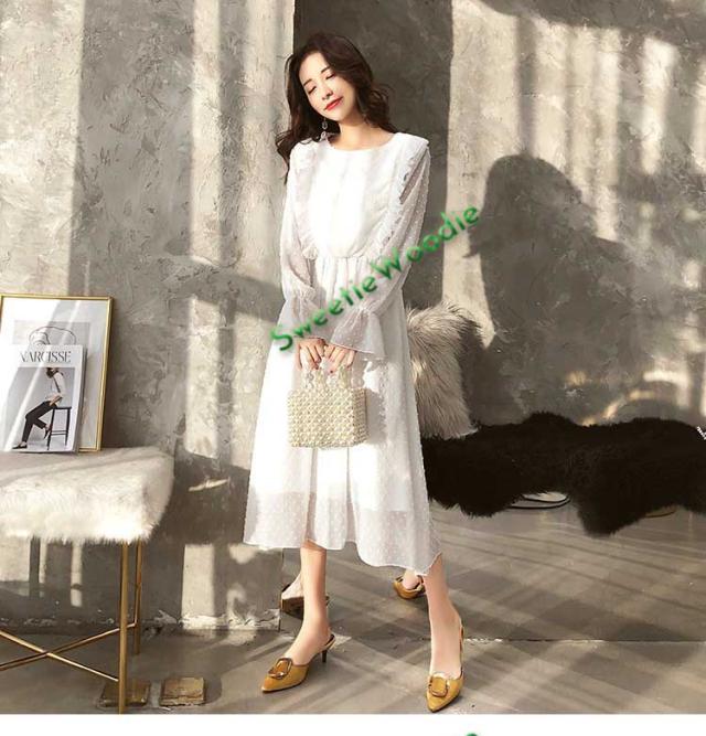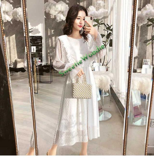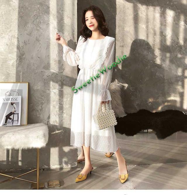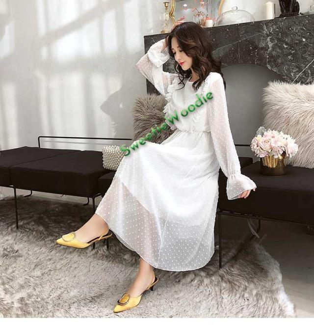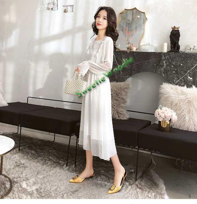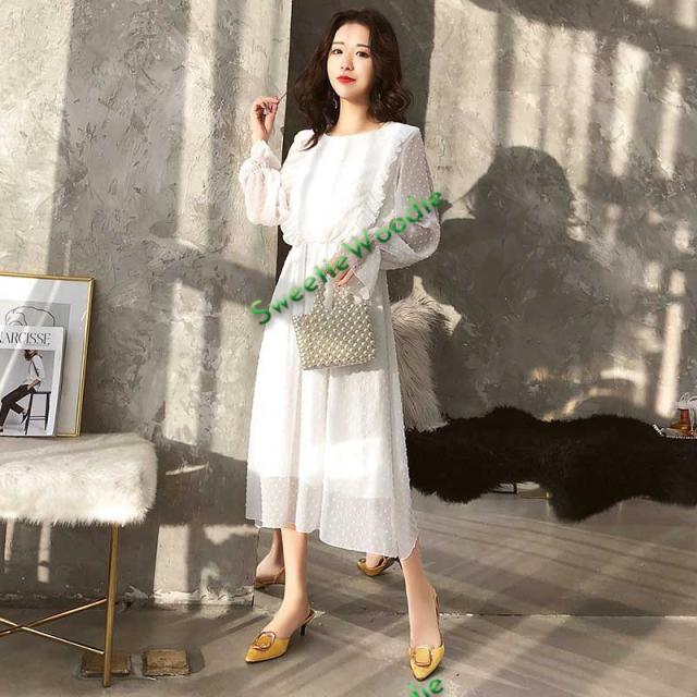 レディースワンピースドレスマキシ丈ワンピース春秋レースチュールスカートフレア長袖きれいめマキシ丈ワンピドレス結婚式着痩せ白