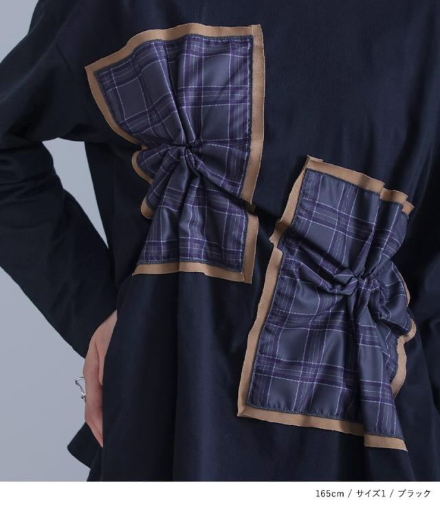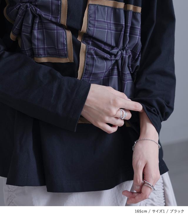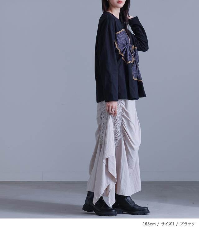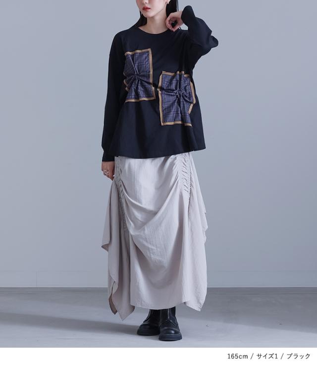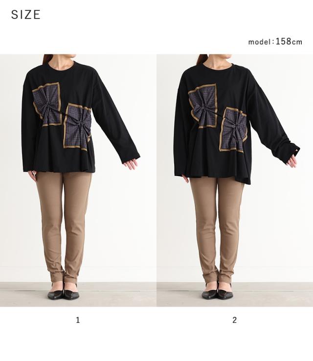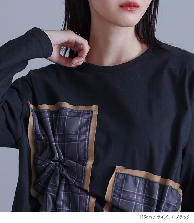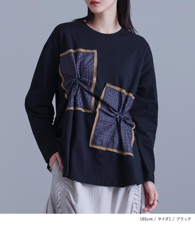 『チェックタックカットソー』※メール便可※【10】[カットソー 長袖 レディース トップス Tシャツ ロンT クルーネック チェック柄 コットン混 ドッキング タック 微光沢 体型カバー 春 秋]