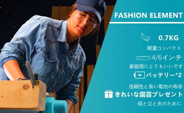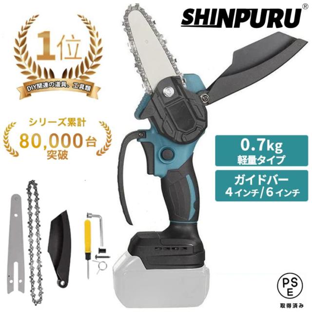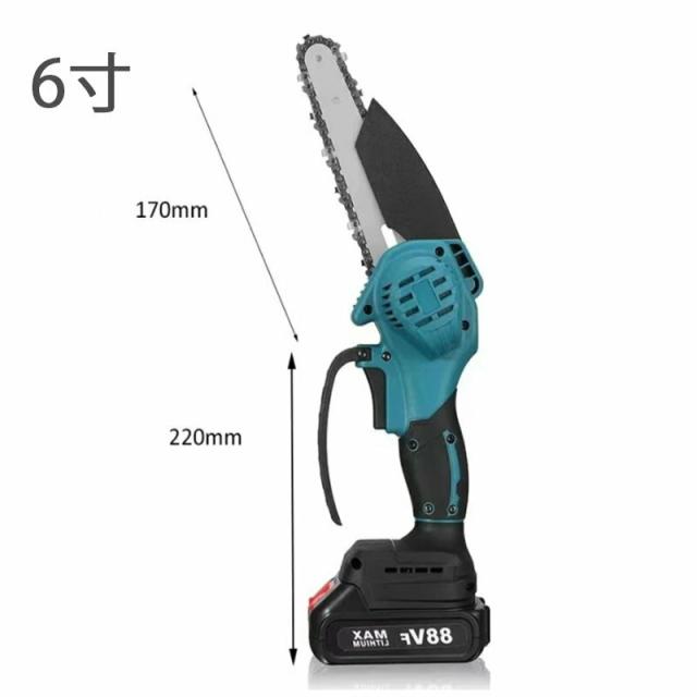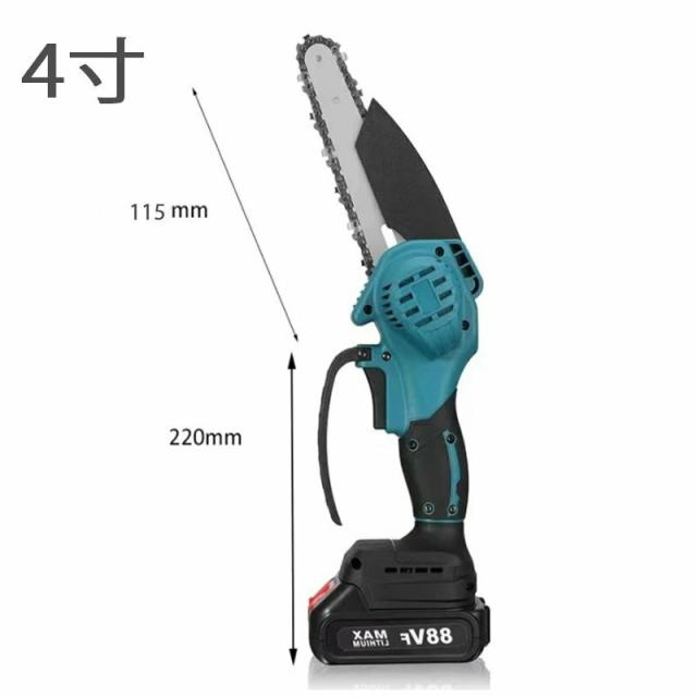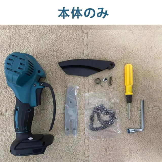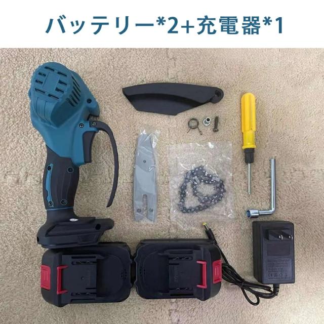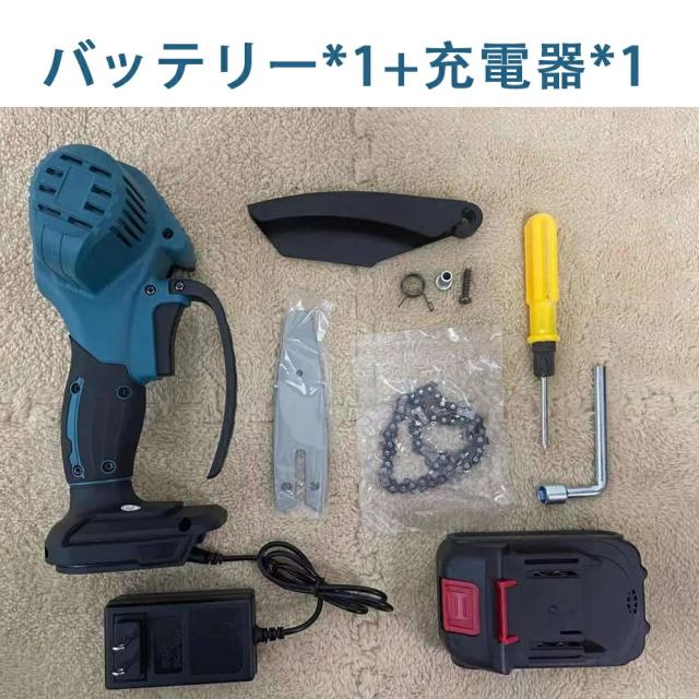 4/6インチ軽量チェンソー*1、バッテリー+充電器*1(追加可能)、チェーン、ガイドプレート、?手*1、日本語取扱説明書*1。