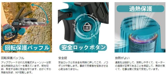 2つの安全対策により、電動ミニチェーンソーは確実な安全性を確保します: スイッチロック、不用意な起動からの保護、家族の保護。