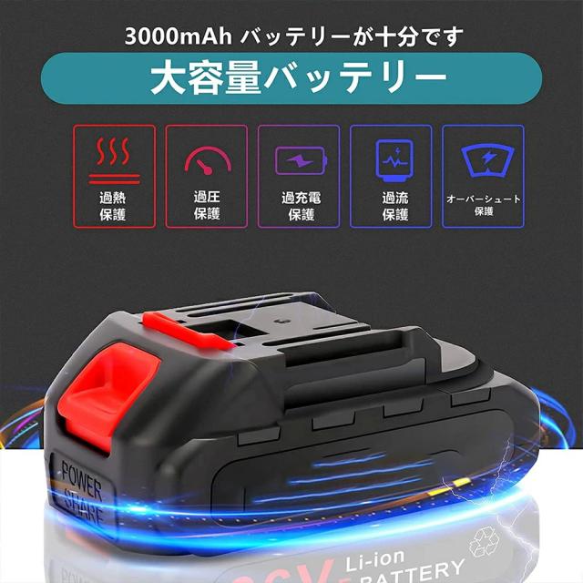ミニチェーンソーのバッテリーは21V 2.0Ah大容量リチウムイオンバッテリーを使用していますので、30分長時間作業ができます。