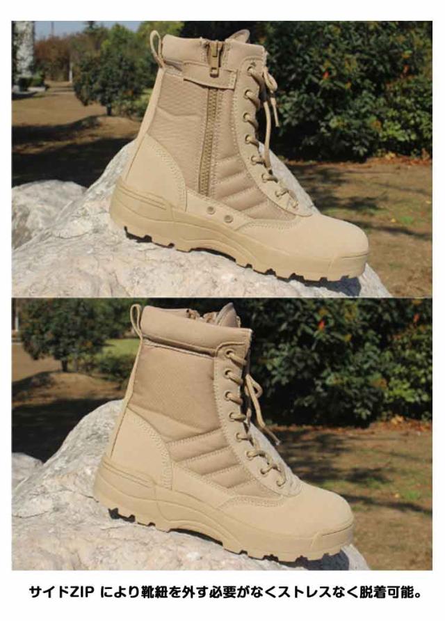 | サイドジッパー仕様、タクティカルブーツ ライダーブーツ 作業靴 シューズ サイドZIP により靴紐を外す必要がなくストレスなく脱着可能。 靴底は、ゴムで 防滑フィット! サイドジッパー仕様なので、脱ぎ履き楽々。 シンプルなデザインにしっかりと作られた厚めのソールで カーゴパンツ との相性は抜群。素材もしっかりしており、長年愛用頂ける靴に仕上がりました。 普段着ファッション、ハイキングシューズ、 ライダーブーツ、 サバゲ、サバイバルゲームに! | |