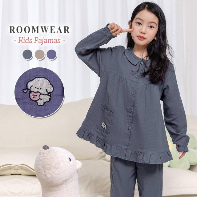 キッズ パジャマ 長袖 前開き 女の子 セットアップ セパレート 2点セット トップス チュニック パンツ ルームウェア ポケット ボタン フリル ウエスト 袖口 裾 ゴム ゆったり 110 120 130 140 150 幼稚園 保育園 小学生 低学年 高学年 春 秋