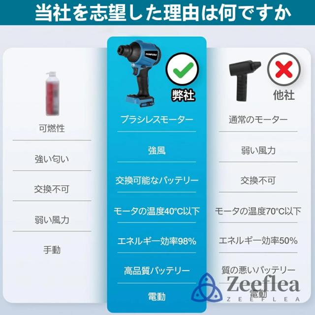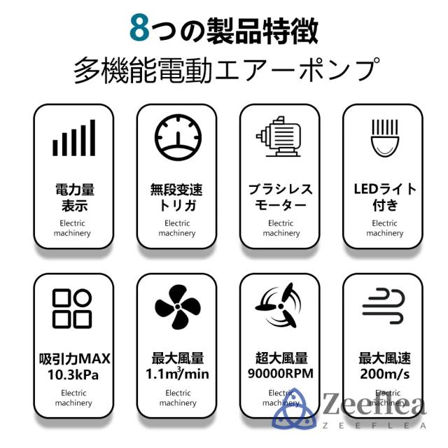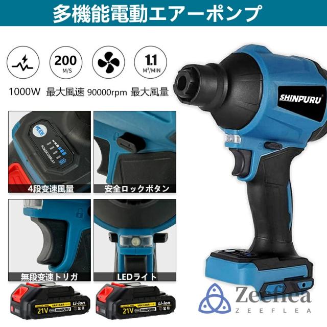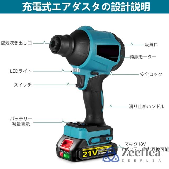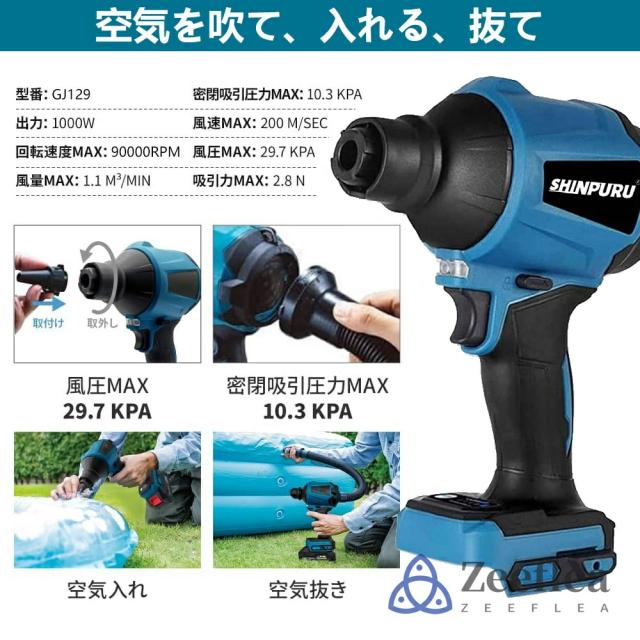 Zeefleaの本製品はエアダスター、ブロワー、空気入れの3つの機能性を兼ね揃えています。通常の電動エアーポンプと比べて、1000Wの出力が大きく、90000RPMの回転速度は更に速くて、製品をすばやく膨張および収縮させることができ、時間を節約し、通常のエアポンプの数倍です。OA機器用除塵機として、ブロー機能だけでなく、吸引機能も備えており、最大吸引力2.8Nで、軽いものや小さなものを吸引できます。ブロワーとして、カタツムリ状のものよりも形状が小さく、最大風量は1.1m?/minに達し、最大風速は200m/secです。最大風圧は29.7 kPaで、これは約 3メートルの水柱に相当します。洗車後の水滴、落ち葉、散った花びら、ほこり、その他のゴミを効果的に除去でき、庭や花園の清掃、洗車に非常に適しています。頑固な汚れや小さな石でも簡単に吹き飛ばすことができ、使用効果が高く、便利で耐久性があります。
