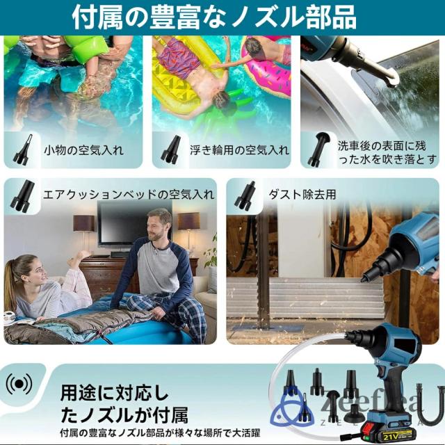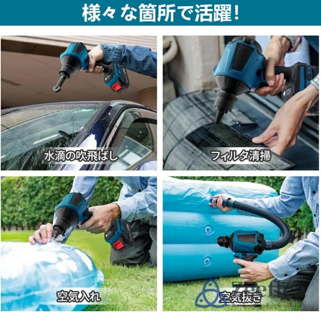 様々なシーンに適応できるため、8種類のノズルアタッチメント付属しております。ご家庭作業台やオフィスにあるあらゆる電子機器のホコリやゴミを取り除くだけでなく、車窓の水滴を吹飛ばして、落ち葉掃除、エアマットレスやスイミングリングを素早く膨らませることができる操作しやすい多機能機です。