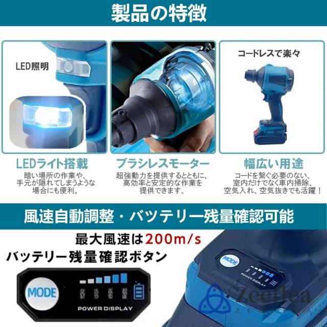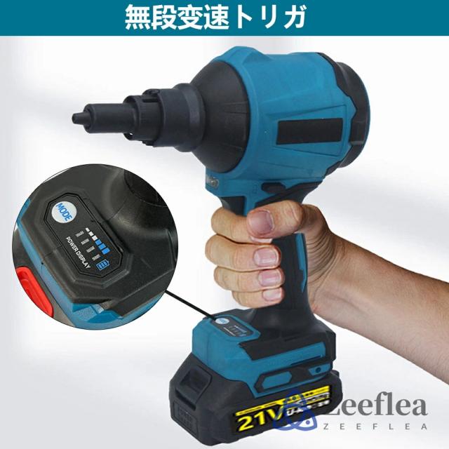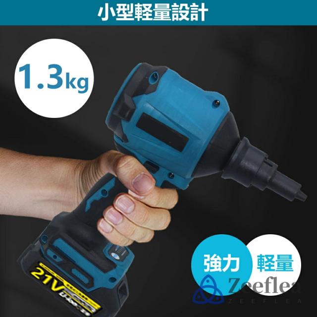 電動エアダスターは長寿命で騒音がないブラシレスモーターを使用して、従来のエアダスターから約2倍の威力となり、風速やバッテリーが弱いという問題点を解決しました。最強化版電動エアダスターです!また、電動エアポンプはマキタ18V純正バッテリーと互換が可能です。(注意:バッテリー・充電器別売 ) 【無段階風量調整★安全ロック機能★LED残量表示機能】ブロワーの風速は無段階に調整でき、トリガーを押す力によって簡単に風速を調整でき、操作が簡単で使用便利です。また、トリガーロック機能を搭載し、セーフティロックボタンを押してから、トリガを引くことができます。これにより、誤って開いた場合の損傷が大幅に軽減されます。電動エアポンプ本体にもLED残量表示機能が付いており、残量表示ボタン(MODE)を押すとバッテリー残量が4段階で表示されます。バッテリーはどのくらい容量があるか一見だけで分かって安心します。