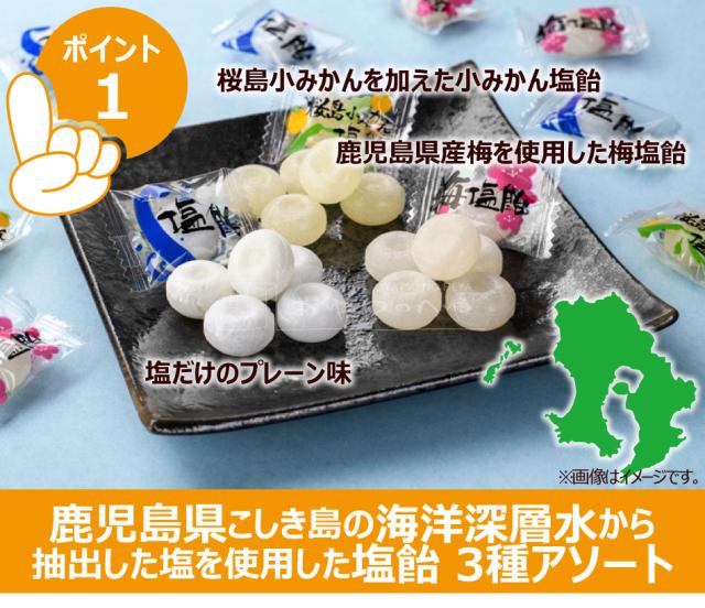 鹿児島県甑(こしき)島の海洋深層水から抽出した塩を使用し、塩だけのプレーン味、桜島小みかんを加えた小みかん塩飴、鹿児島県産梅を使用した梅塩飴の3種類アソート塩飴です。