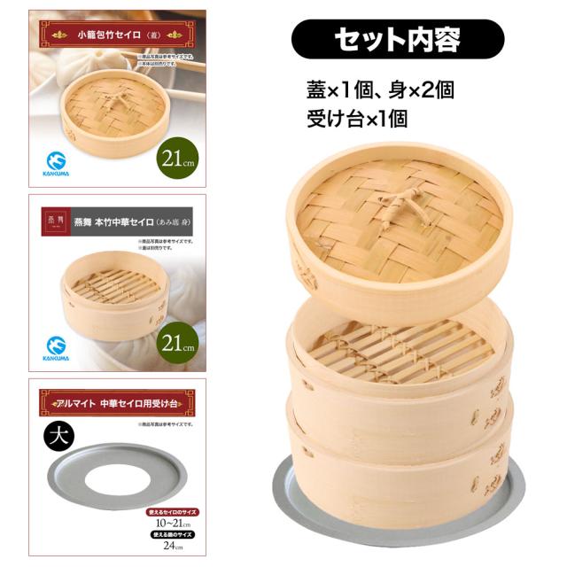セット内容 | 「本竹・小籠包セイロ」 蓋 21cm : 1個 「燕舞 Yan Wu 本竹中華セイロ」 身(本体) 21cm : 2個 「中華セイロ用受け台 中 せいろ10〜21cm用 鍋24cm用 北陸アルミニウム」:1個 ・おまけ「せいろ用調理用紙」21cm:10枚 |