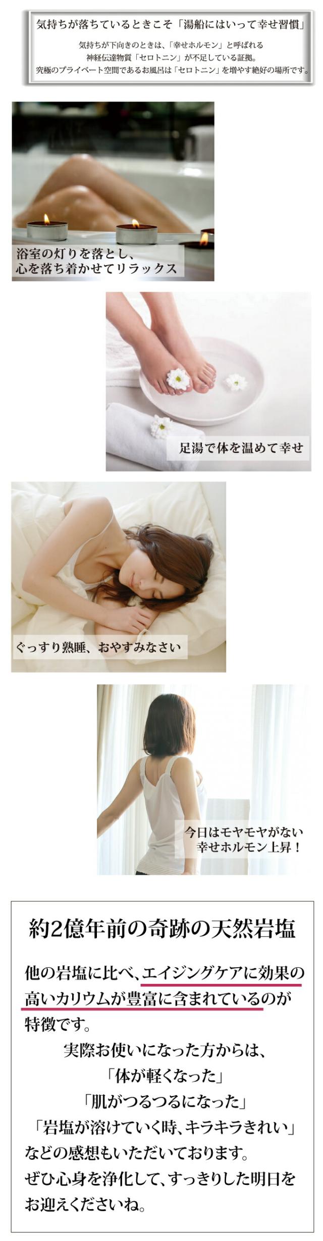 無防備な状態で入るお風呂だから、入浴剤は安心安全なものを。数億年の時を経て結晶化された岩塩。自然のパワーを体いっぱいで感じて心も体もリラックスできる神秘のバスソルトです。