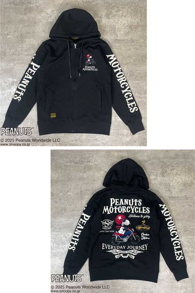 大人気のSNOOPYコラボから新登場!! アメリカンバイクに乗るSNOOPYを胸部にも背中にも刺繍! WOODSTOCKやバイカーのロゴを沢山取り入れたデザインがかわいい♪ 袖のPEANUTS MOTORCYCLEのロゴでワイルドさをプラスした最高の一着です♪ | ||||||||||||||||||||||||||