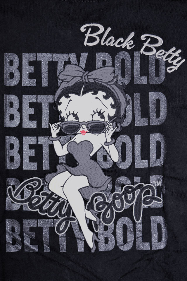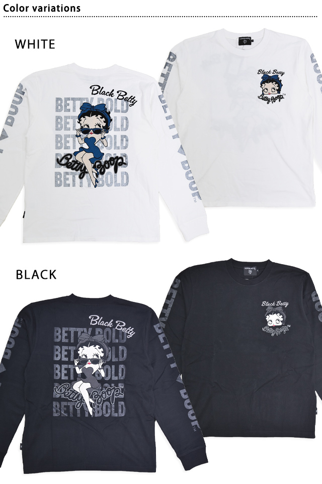 BETTY×ネバーマインド 天竺長袖Tシャツ(BBN-2510)のご紹介です。 大きな瞳とぽってりした赤い唇が印象的な女の子、ベティ・ブープ(Betty Boop)。 今回は大きなリボンとドレスがキュートなベティを、背中に刺繍しました。 背景や袖に用いられたロゴには、ラメプリントを使用。 フロント左胸には、ベティのフェイスアイコンをワンポイントで刺繍しました。 ボディーには、ややしっかりとした刺繍に負けない強さを持ったTシャツ生地を採用。 襟元、袖口にはリブを配置しました。 カジュアルに着こなしに取り入れることの出来る、大人のキャラクターアイテムです。 | |||||||||||||||||||||||||