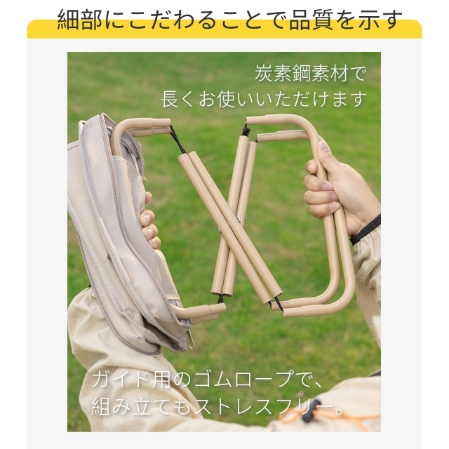 チェアフレームは炭素鋼素材を使用、優れた強度と超軽量の骨組みで?量かつ安定性も抜群です。 ●コンパクトに収納!