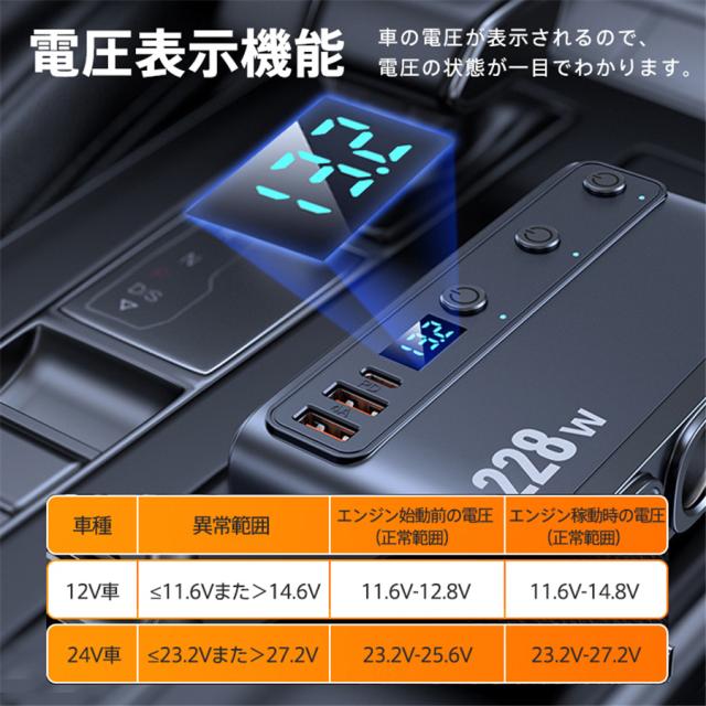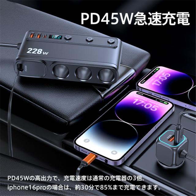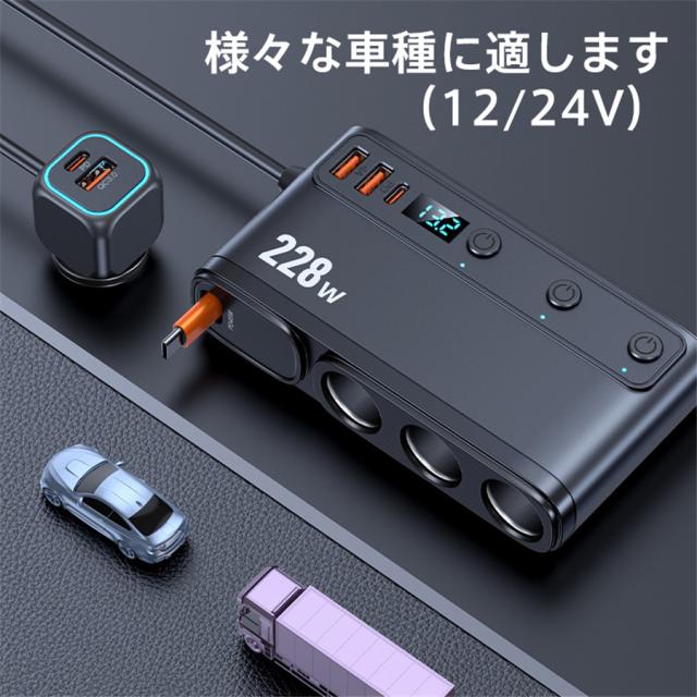 シガーソケット 車載充電器 3連 9in1 usbポート 228W 増設ソケット PD45W 急速充電 12V/24V