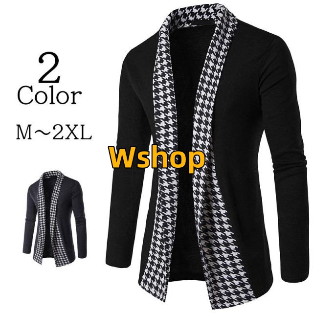 在庫限りの大特価 品質安心 トップス アウター 羽織り タイト ショールカラー レビュー高評価 メンズ おしゃれ 長袖 ボタンなし 細身 千鳥格子 送料無料 ボタンレス カーディガン モノトーン 軽量仕様 お買い得プライス
