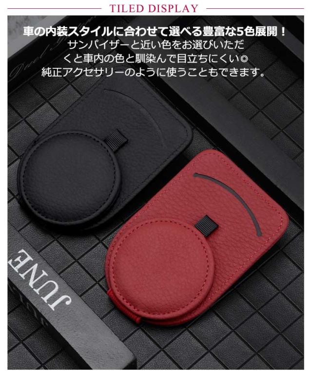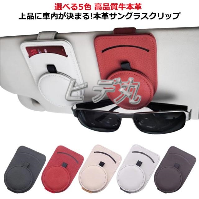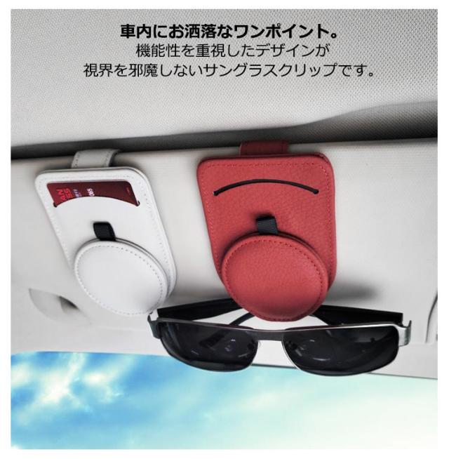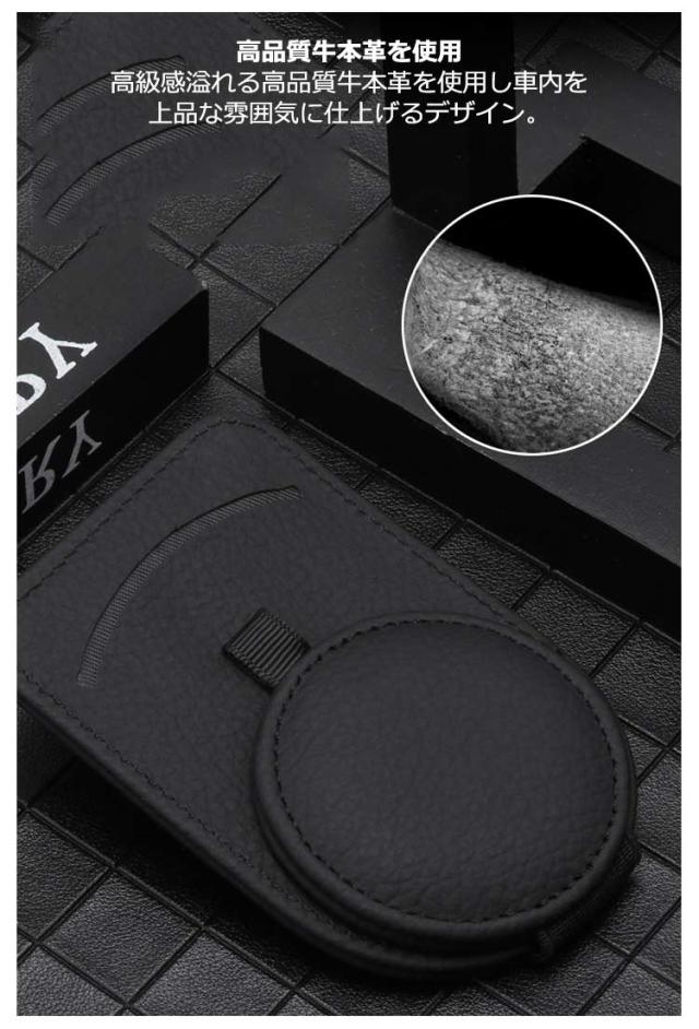 | 選べる5色 高品質牛本革 上品に車内が決まる!本革サングラスクリップ 高品質牛本革を使用 高級感溢れる高品質牛本革を使用し車内を上品な雰囲気に仕上げるデザイン。 車内にお洒落なワンポイント。 機能性を重視したデザインが視界を邪魔しないサングラスクリップです。 車の内装スタイルに合わせて選べる豊富な5色展開! サンパイザーと近い色をお選びいただくと車内の色と馴染んで目立ちにくい◎ 純正アクセサリーのように使うこともできます。 強力なマグネットでサンバイザーを開けても落ちない! フックと磁石でしっかり留まっているのでサンバイザーの開閉も安心です。 省スペースなデザインでミラーを遮らない。 取付簡単! 設置は一瞬。クリップフックの親切設計。サンバイザーにはさむだけなので届いたその日にすぐ使えます。 片手さっと取り出し&収納OK! フックでサンバイザーに挟むだけなのでご高齢の方でも快適にご使用いただけます。 ほぼすべての眼鏡、サングラス収納に適用いたします。 通行券、駐車券、領収証、カード収納クリップとしてもご使用いただけます。 | |
