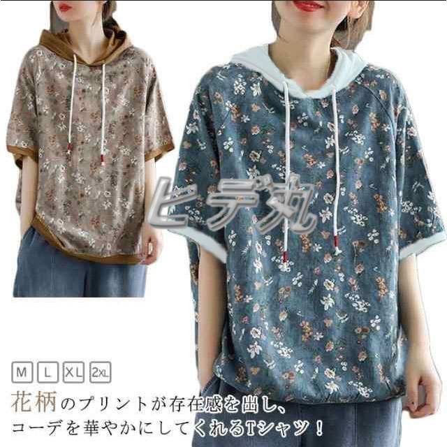 カットソー 花柄 半袖シャツ レディース 花柄 フード付き パーカー 花柄Tシャツ プルオーバー トップス 無地 薄手 花柄 花柄パーカー チュニック Tシャツ シンプル 半袖 夏物 カジュアル 体型カバー ブラウン