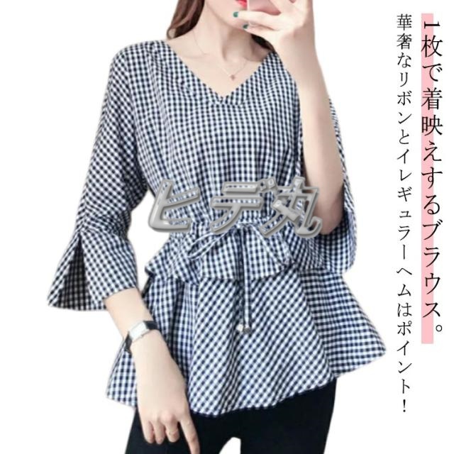 フレンチスリーブ レディース ペプラム 春 ブラウス ティアード フリル ペプラムブラウス フレア ブラウス ティアードチュニック フレアチュニック 五分袖 Vネック チェック柄 ティアードチュニック 夏 薄手 体型カバー