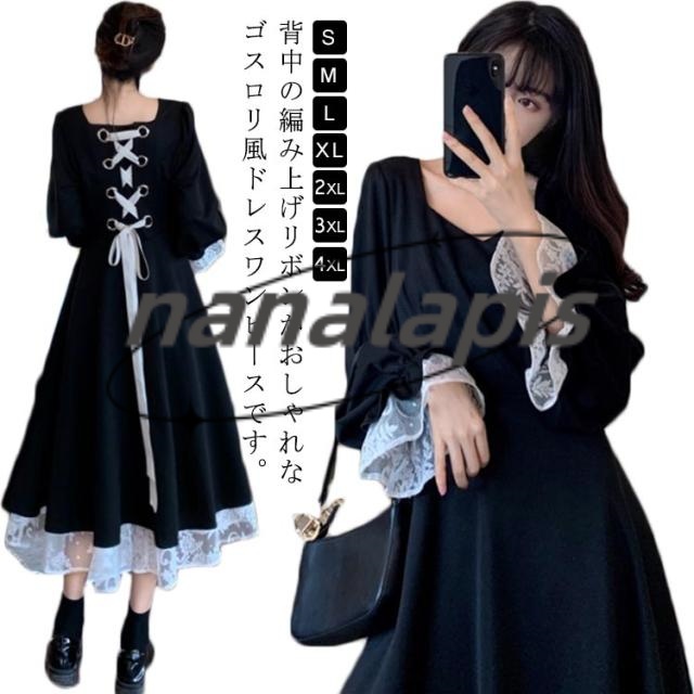 お出かけ お嬢様 ロリータ ワンピース ロング レース切り替え パーティードレス S?4XL!ゴスロリ 長袖 バック編み上げリボン パーティー コスプレ キレイめ 30代 40代