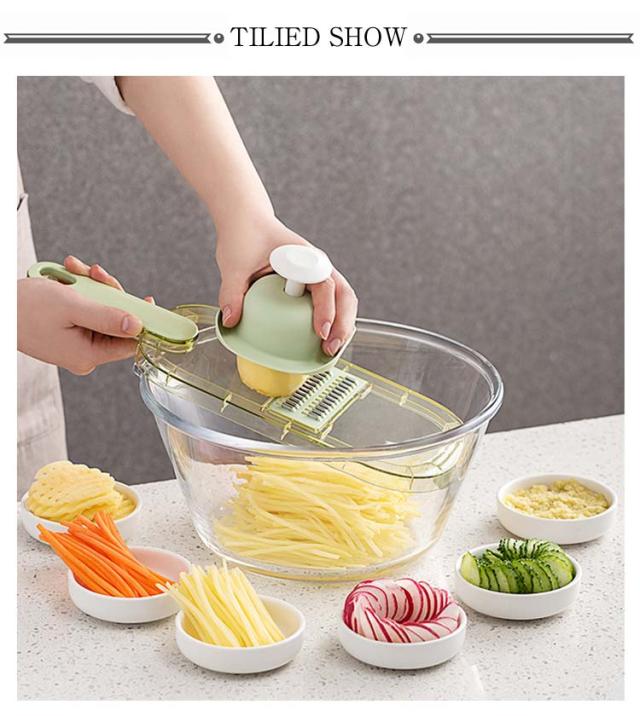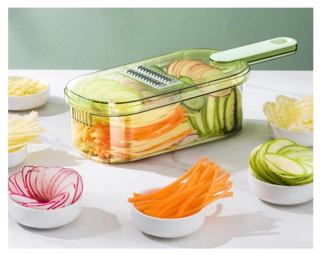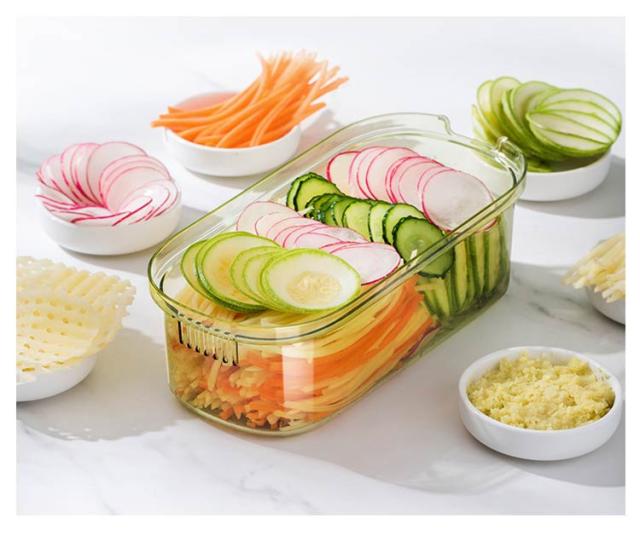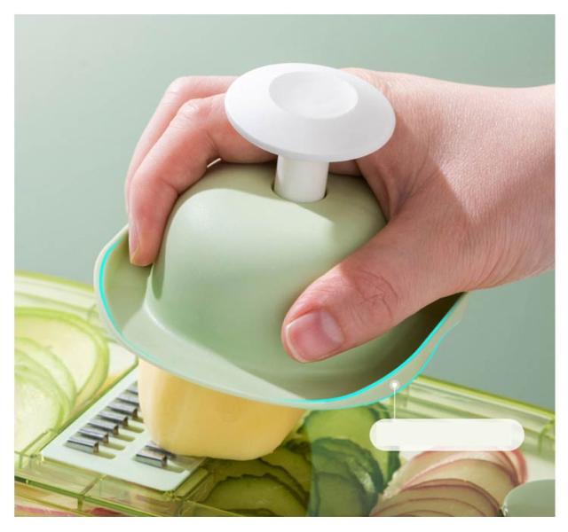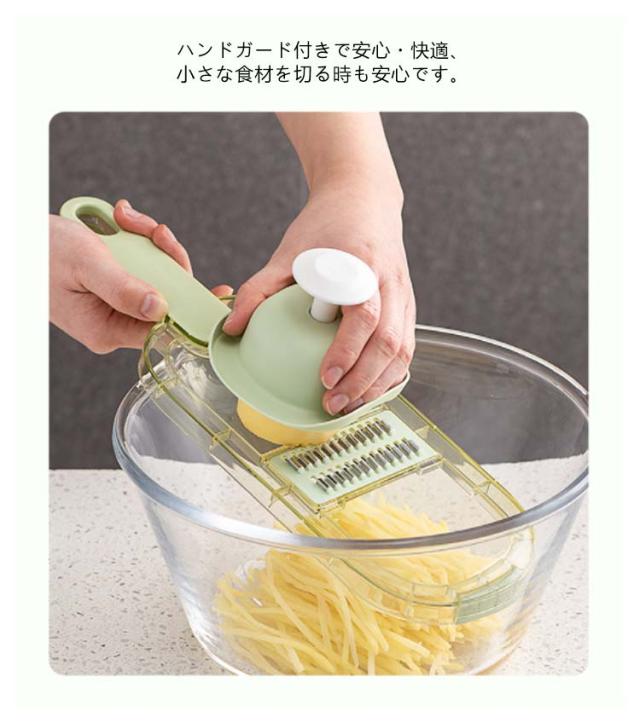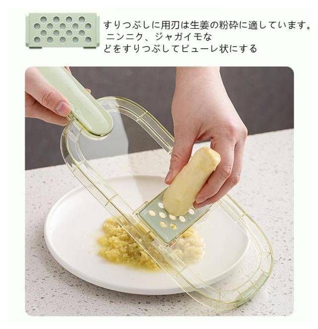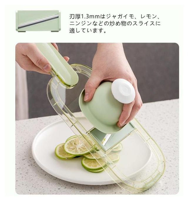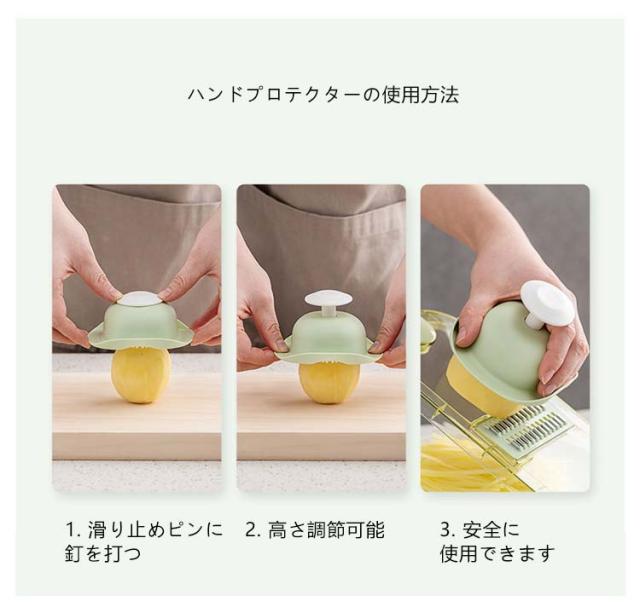 | 千切りやスライスができる多機能キッチンツール ハンドガード付きで安心?快適、小さな食材を切る時も安心です。 食品グレードのPET素材を使用しており、お手入れが簡単です。 大きな穴があり、吊り下げや保管に便利で、スペースを節約できます。 ハンドプロテクターの使用方法: 1. 滑り止めピンに釘を打つ 2. 高さ調節可能 3. 安全に使用できます 刃を外します 1. メインブレードを奥からゆっくりと押し出します。 2.刃を正面から取り出す ブレードを取り付けます。 1. ブレードをスロットに合わせます 2. 押さえた端を差し込みます 5mmの刃はジャガイモ、大根、キュウリなどの炒め物の千切りに適しています。 3mmの刃はキュウリ、レタス、ズッキーニ、その他のサラダ料理を切るのに適しています。 1.5mmの刃はキュウリ、レタス、ズッキーニなどの飲用スライスに適しています。 刃厚1.3mmはジャガイモ、レモン、ニンジンなどの炒め物のスライスに適しています。 すりつぶしに用刃は生姜の粉砕に適しています。 ニンニク、ジャガイモなどをすりつぶしてピューレ状にする 波状の花をカットする用刃はジャガイモやニンジンなどを切るのに適しています。 | |