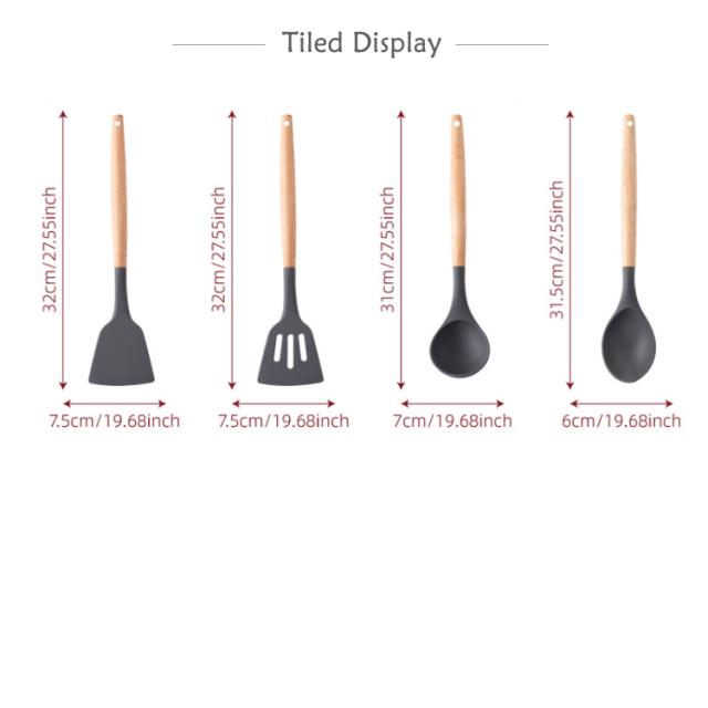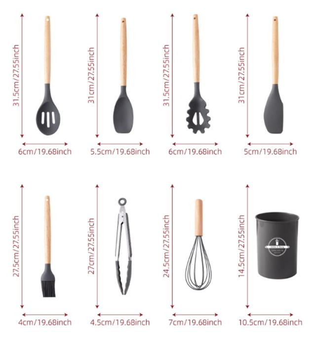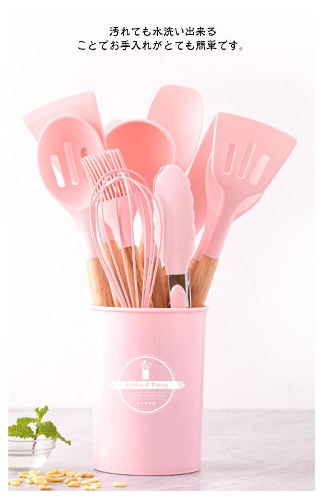 | 安全なシリコン素材で作られたキッチンツール12点セット 統一感と清潔感が備え、キッチンの雰囲気に合わせ、飾れるようになります。 高品質なシリコン製で、柔らかくて鍋などに傷をつけることを心配する必要がありません。変形・変色もしにくく、デザイン性と機能性が兼ね備えたキッチンツールです。 ノンスティックで食材が付着することによるロスも少なく、洗浄も簡単です。 汚れても水洗い出来ることでお手入れがとても簡単です。 耐熱温度は-40℃?230℃までです。先端はシリコン製なので、安全素材で耐高低温性に優れ、耐久性も備えています。 食器洗い機、食器乾燥機にも対応できます。 木製の持ち手は滑らかで手持ちやすいです。 2WAYで収納便利。壁に掛けて収納ができるのと専用の収納ボックスにすっきりと収まる。 | |