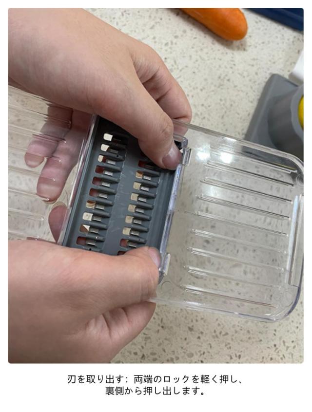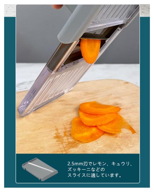 | しっかり置いて野菜を均等にきれいにカット ハンドプロテクターが付属しており、安全で快適な、完全に包まれたハンドプロテクターです。 鋭利なステンレス鋼の刃はカビに強く、耐摩耗性があり、お手入れが簡単で、素早く切断でき、鋭利で耐久性があります。 千切りとスライスの両方に使用できるさまざまな刃が用意されています 2.5mm刃でレモン、キュウリ、ズッキーニなどのスライスに適しています。 3.3mm刃でキュウリ、ジャガイモ、大根などの千切りに適しています。 4.5mm刃でキュウリ、ジャガイモ、大根などの千切りに適しています。 刃を取り出す:両端のロックを軽く押し、裏側から押し出します。 | |