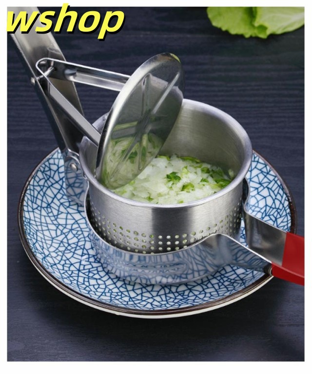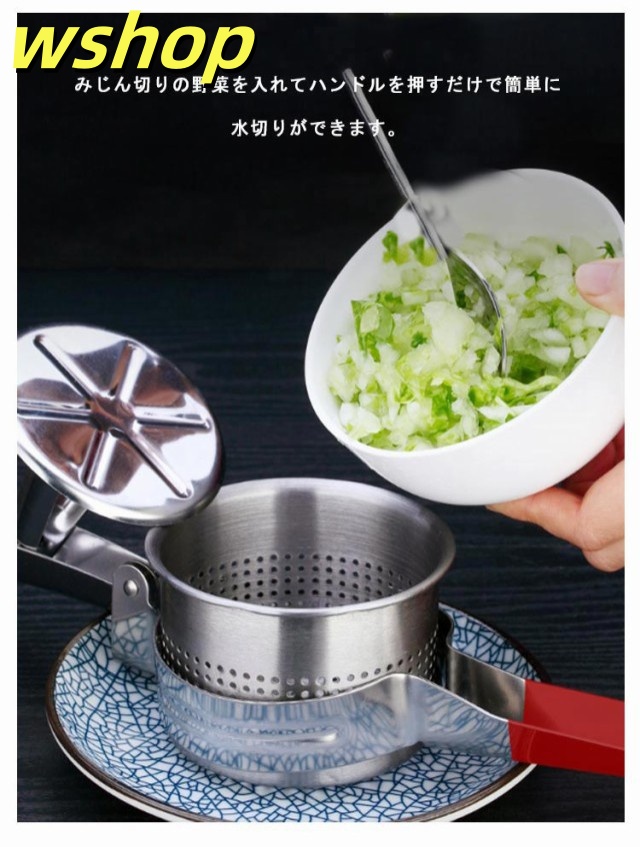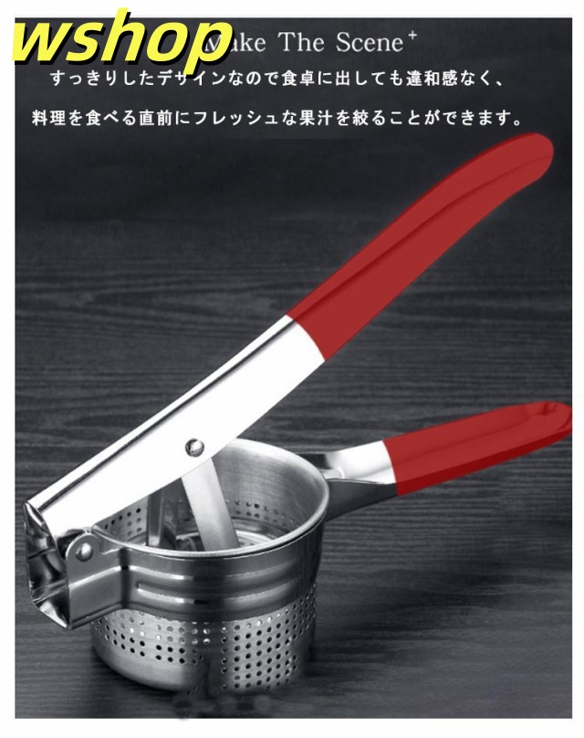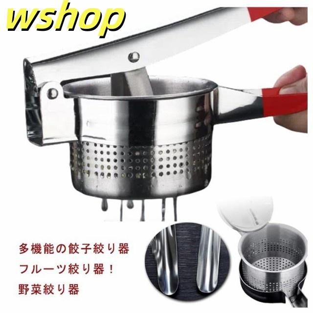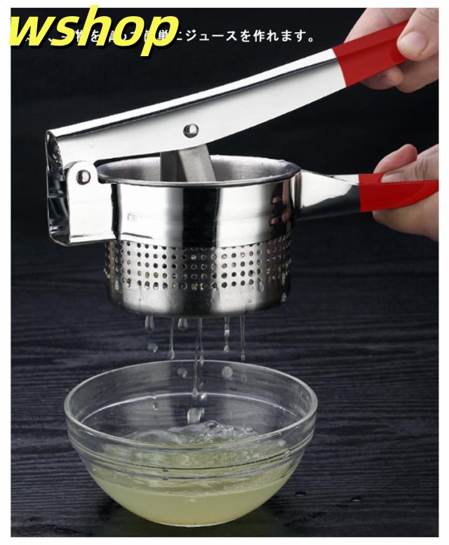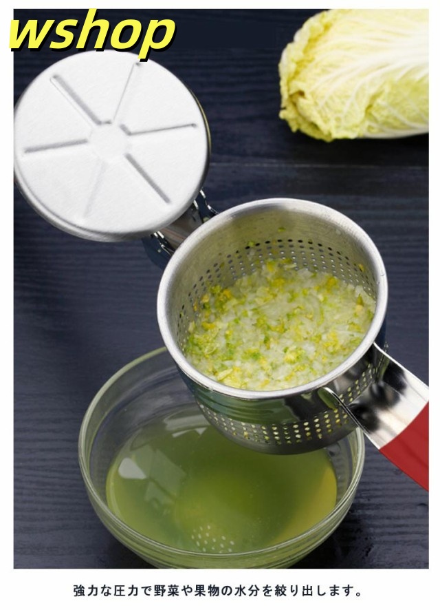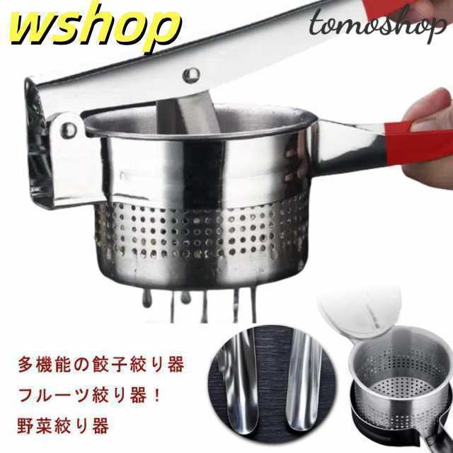 | 多機能の餃子絞り器・野菜絞り器・フルーツ絞り器! みじん切りの野菜を入れてハンドルを押すだけで簡単に水切りができます。 また、果物を搾って簡単にジュースを作れます。 強力な圧力で野菜や果物の水分を絞り出します。 すっきりしたデザインなので食卓に出しても違和感なく、料理を食べる直前にフレッシュな果汁を絞ることができます。 本体はステンレス製なので錆びにくく衛生的です。 | |