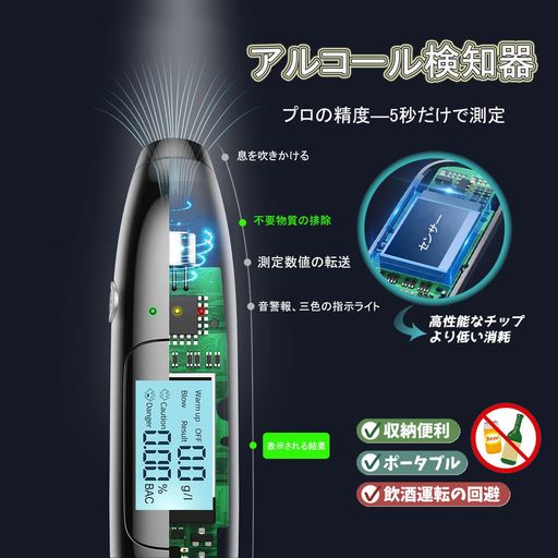 ★【超高性能・超高精度】:アルコールチェッカーは高性能半導体式ガスセンサーを使用し、強い干渉を防ぐことができます。電源を入れると、余分な空気を自動的に排除し、短時間で正確に検出することを確保します。息を吹きかけるだけで簡単に測定できます。測定範囲:0.00-0.19BAC(0.0-1.9g/L )。ご注意:本製品は飲酒運転の可否を判定する機器ではありません。