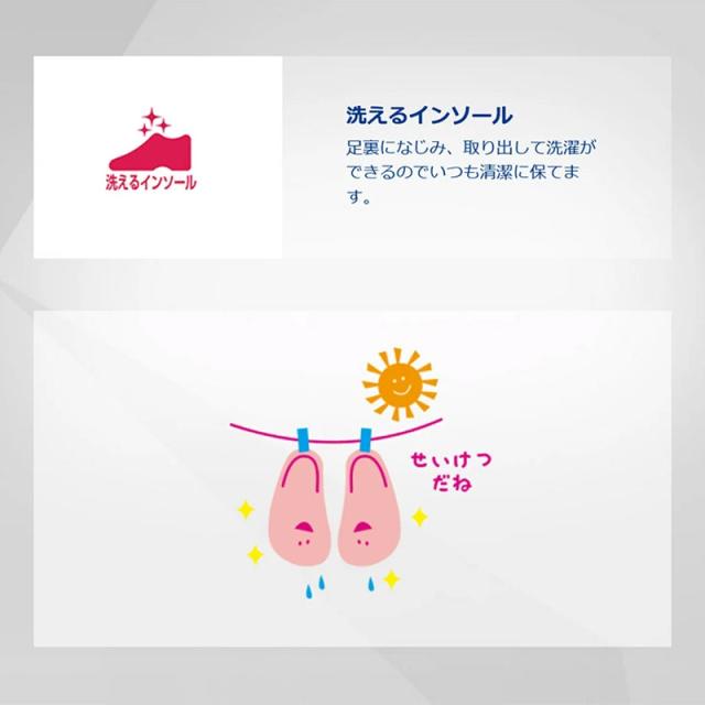 足幅が広めのお子さまに向けた「3E」商品です。子どもの足の成長をサポートする「4つの機能」に加え、「速乾性」を備えた機能商品です。乾き易い素材や構造で、汚れても気軽に洗えます。ベーシックなデザインで通園・通学用としておすすめです。足ゆびの運動を促す「あしゆbeゲンキ」機能も搭載しています。