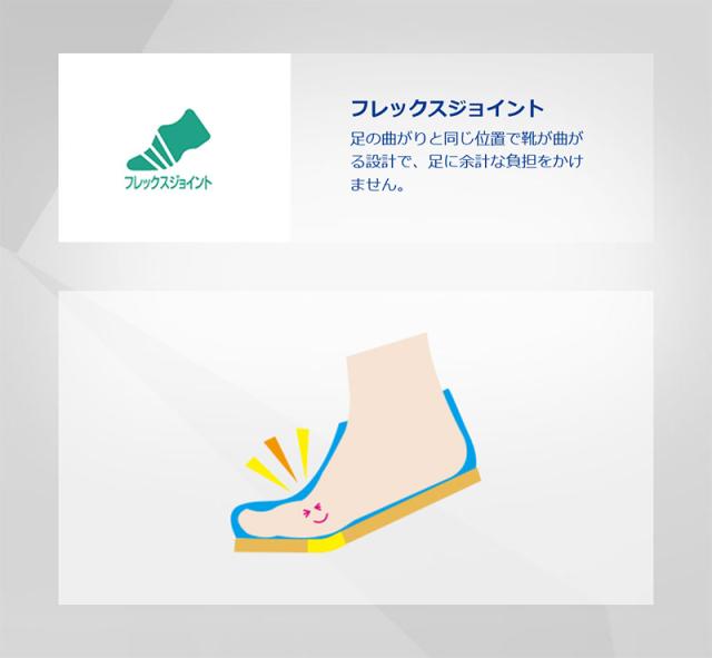 足の曲がりと同じ位置で靴が曲がる設計で、足に余計な負担をかけません。