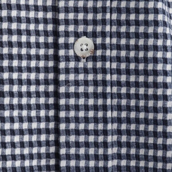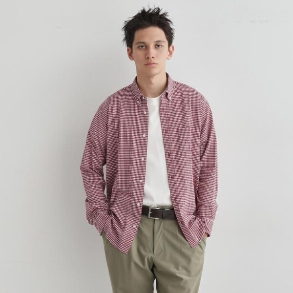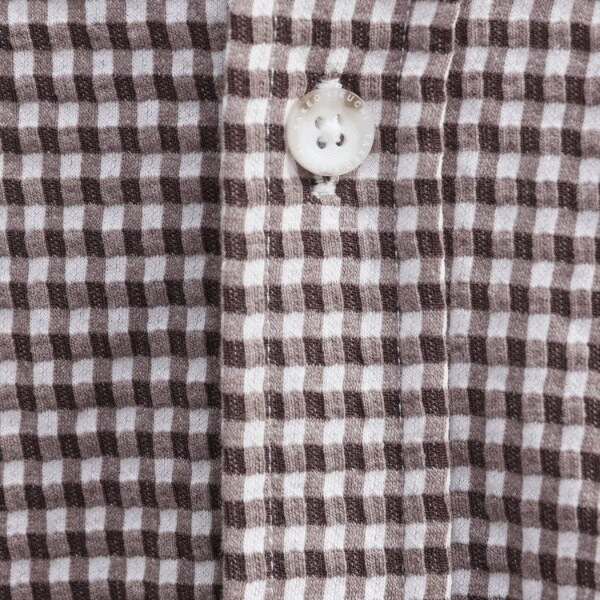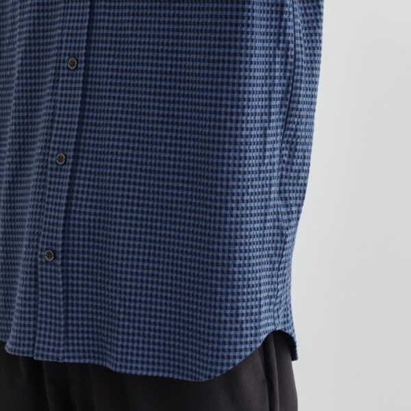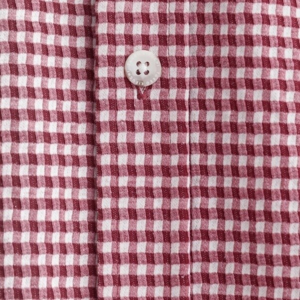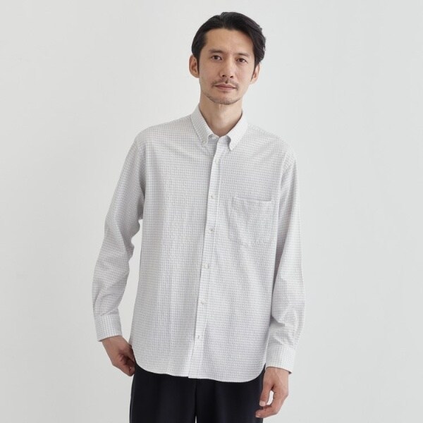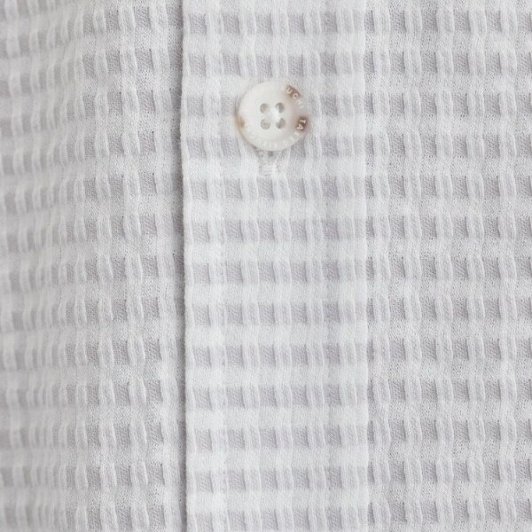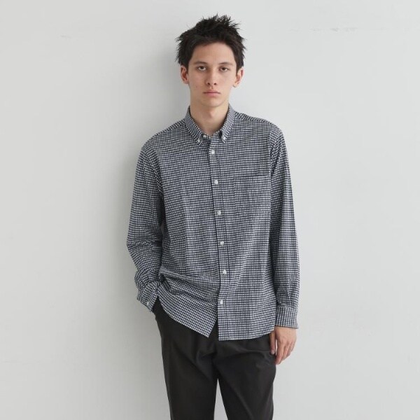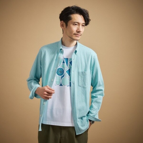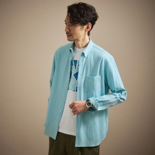 ジャージ素材のシアサッカーギンガムチェックを使用したON/OFF使いができるベーシックデザインの長袖のシャツです。