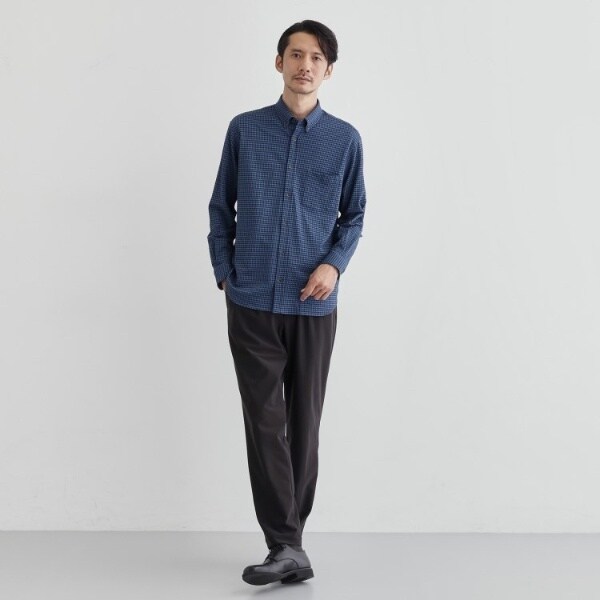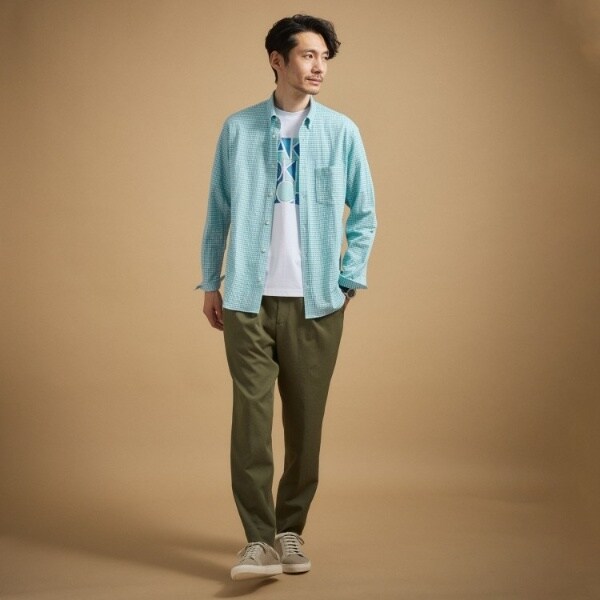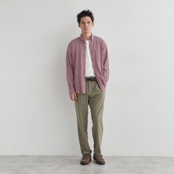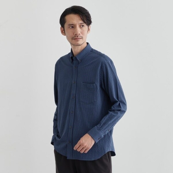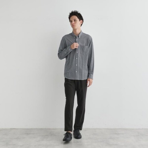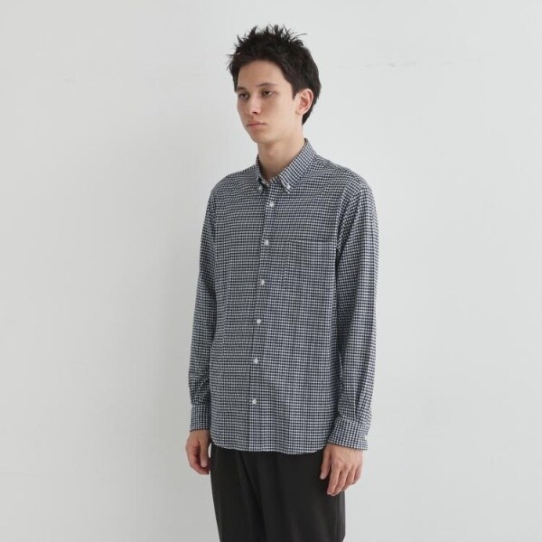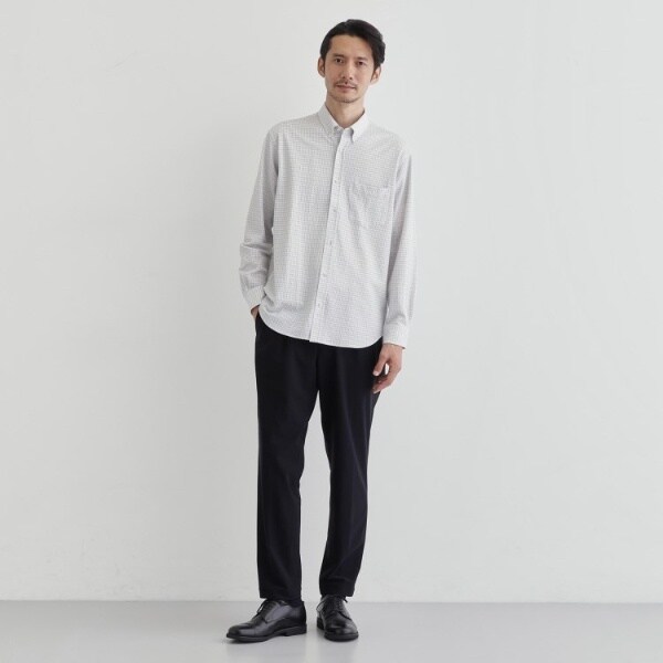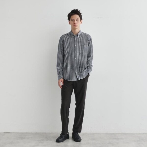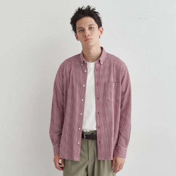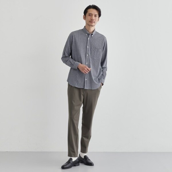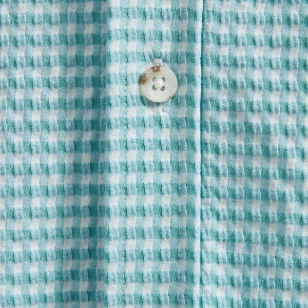 ジャージ素材のシアサッカーギンガムチェックを使用したON/OFF使いができるベーシックデザインの長袖のシャツです。